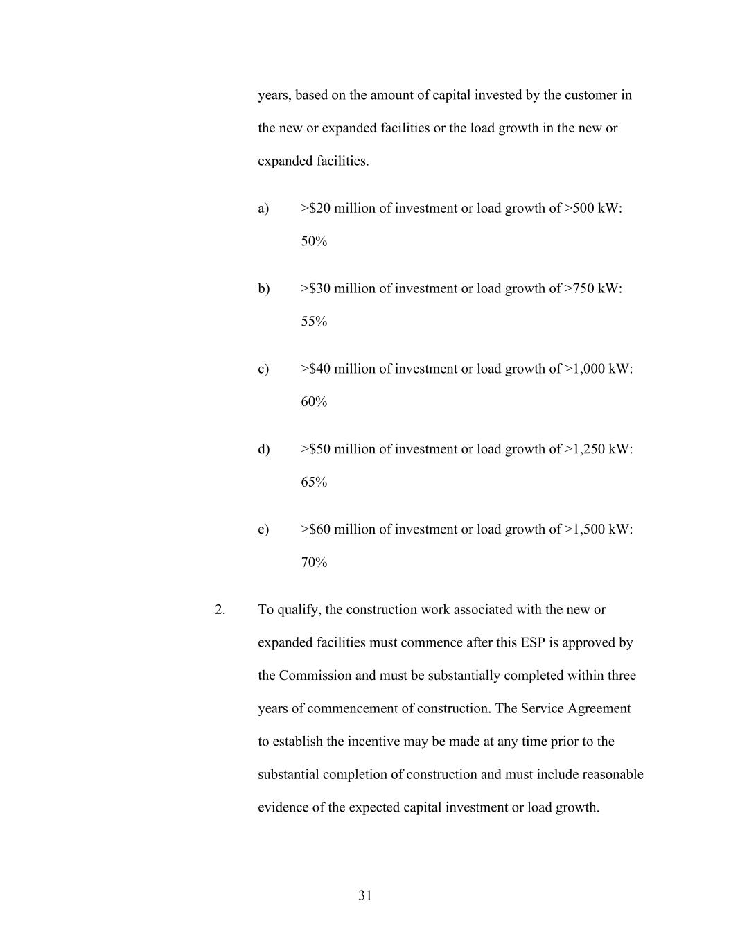 31 years, based on the amount of capital invested by the customer in the new or expanded facilities or the load growth in the new or expanded facilities. a) >$20 million of investment or load growth of >500 kW: 50% b) >$30 million of investment or load growth of >750 kW: 55% c) >$40 million of investment or load growth of >1,000 kW: 60% d) >$50 million of investment or load growth of >1,250 kW: 65% e) >$60 million of investment or load growth of >1,500 kW: 70% 2. To qualify, the construction work associated with the new or expanded facilities must commence after this ESP is approved by the Commission and must be substantially completed within three years of commencement of construction. The Service Agreement to establish the incentive may be made at any time prior to the substantial completion of construction and must include reasonable evidence of the expected capital investment or load growth.
