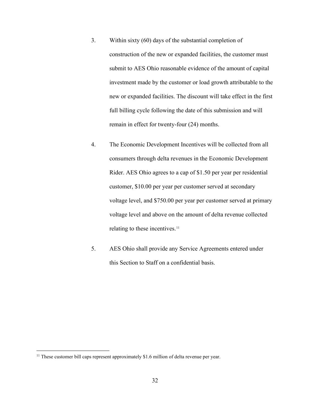 32 3. Within sixty (60) days of the substantial completion of construction of the new or expanded facilities, the customer must submit to AES Ohio reasonable evidence of the amount of capital investment made by the customer or load growth attributable to the new or expanded facilities. The discount will take effect in the first full billing cycle following the date of this submission and will remain in effect for twenty-four (24) months. 4. The Economic Development Incentives will be collected from all consumers through delta revenues in the Economic Development Rider. AES Ohio agrees to a cap of $1.50 per year per residential customer, $10.00 per year per customer served at secondary voltage level, and $750.00 per year per customer served at primary voltage level and above on the amount of delta revenue collected relating to these incentives.11 5. AES Ohio shall provide any Service Agreements entered under this Section to Staff on a confidential basis. 11 These customer bill caps represent approximately $1.6 million of delta revenue per year.