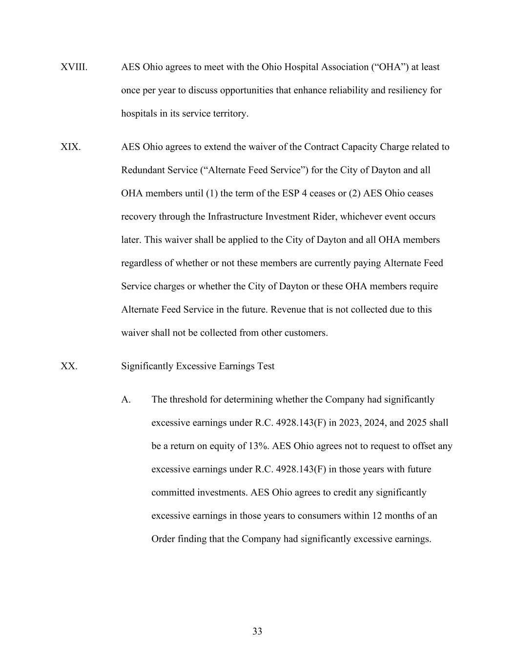 33 XVIII. AES Ohio agrees to meet with the Ohio Hospital Association (“OHA”) at least once per year to discuss opportunities that enhance reliability and resiliency for hospitals in its service territory. XIX. AES Ohio agrees to extend the waiver of the Contract Capacity Charge related to Redundant Service (“Alternate Feed Service”) for the City of Dayton and all OHA members until (1) the term of the ESP 4 ceases or (2) AES Ohio ceases recovery through the Infrastructure Investment Rider, whichever event occurs later. This waiver shall be applied to the City of Dayton and all OHA members regardless of whether or not these members are currently paying Alternate Feed Service charges or whether the City of Dayton or these OHA members require Alternate Feed Service in the future. Revenue that is not collected due to this waiver shall not be collected from other customers. XX. Significantly Excessive Earnings Test A. The threshold for determining whether the Company had significantly excessive earnings under R.C. 4928.143(F) in 2023, 2024, and 2025 shall be a return on equity of 13%. AES Ohio agrees not to request to offset any excessive earnings under R.C. 4928.143(F) in those years with future committed investments. AES Ohio agrees to credit any significantly excessive earnings in those years to consumers within 12 months of an Order finding that the Company had significantly excessive earnings.