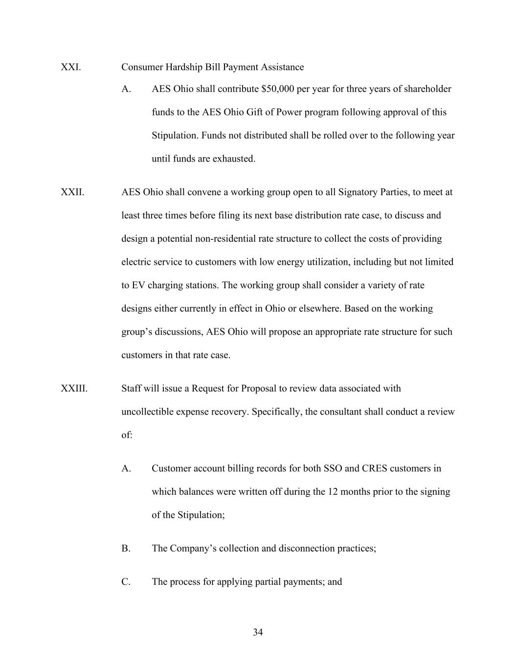 34 XXI. Consumer Hardship Bill Payment Assistance A. AES Ohio shall contribute $50,000 per year for three years of shareholder funds to the AES Ohio Gift of Power program following approval of this Stipulation. Funds not distributed shall be rolled over to the following year until funds are exhausted. XXII. AES Ohio shall convene a working group open to all Signatory Parties, to meet at least three times before filing its next base distribution rate case, to discuss and design a potential non-residential rate structure to collect the costs of providing electric service to customers with low energy utilization, including but not limited to EV charging stations. The working group shall consider a variety of rate designs either currently in effect in Ohio or elsewhere. Based on the working group’s discussions, AES Ohio will propose an appropriate rate structure for such customers in that rate case. XXIII. Staff will issue a Request for Proposal to review data associated with uncollectible expense recovery. Specifically, the consultant shall conduct a review of: A. Customer account billing records for both SSO and CRES customers in which balances were written off during the 12 months prior to the signing of the Stipulation; B. The Company’s collection and disconnection practices; C. The process for applying partial payments; and