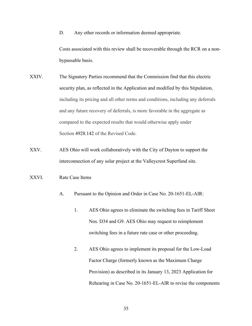 35 D. Any other records or information deemed appropriate. Costs associated with this review shall be recoverable through the RCR on a non- bypassable basis. XXIV. The Signatory Parties recommend that the Commission find that this electric security plan, as reflected in the Application and modified by this Stipulation, including its pricing and all other terms and conditions, including any deferrals and any future recovery of deferrals, is more favorable in the aggregate as compared to the expected results that would otherwise apply under Section 4928.142 of the Revised Code. XXV. AES Ohio will work collaboratively with the City of Dayton to support the interconnection of any solar project at the Valleycrest Superfund site. XXVI. Rate Case Items A. Pursuant to the Opinion and Order in Case No. 20-1651-EL-AIR: 1. AES Ohio agrees to eliminate the switching fees in Tariff Sheet Nos. D34 and G9. AES Ohio may request to reimplement switching fees in a future rate case or other proceeding. 2. AES Ohio agrees to implement its proposal for the Low-Load Factor Charge (formerly known as the Maximum Charge Provision) as described in its January 13, 2023 Application for Rehearing in Case No. 20-1651-EL-AIR to revise the components