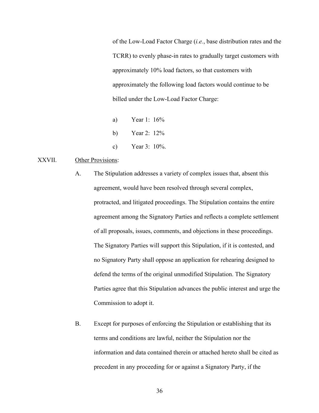 36 of the Low-Load Factor Charge (i.e., base distribution rates and the TCRR) to evenly phase-in rates to gradually target customers with approximately 10% load factors, so that customers with approximately the following load factors would continue to be billed under the Low-Load Factor Charge: a) Year 1: 16% b) Year 2: 12% c) Year 3: 10%. XXVII. Other Provisions: A. The Stipulation addresses a variety of complex issues that, absent this agreement, would have been resolved through several complex, protracted, and litigated proceedings. The Stipulation contains the entire agreement among the Signatory Parties and reflects a complete settlement of all proposals, issues, comments, and objections in these proceedings. The Signatory Parties will support this Stipulation, if it is contested, and no Signatory Party shall oppose an application for rehearing designed to defend the terms of the original unmodified Stipulation. The Signatory Parties agree that this Stipulation advances the public interest and urge the Commission to adopt it. B. Except for purposes of enforcing the Stipulation or establishing that its terms and conditions are lawful, neither the Stipulation nor the information and data contained therein or attached hereto shall be cited as precedent in any proceeding for or against a Signatory Party, if the