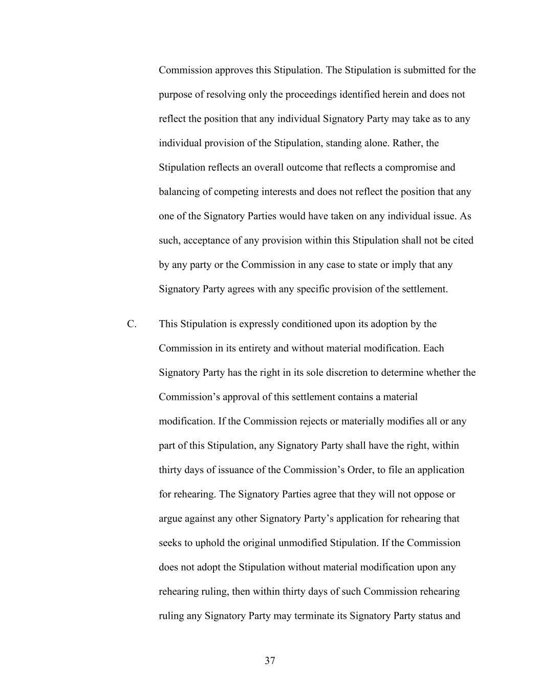 37 Commission approves this Stipulation. The Stipulation is submitted for the purpose of resolving only the proceedings identified herein and does not reflect the position that any individual Signatory Party may take as to any individual provision of the Stipulation, standing alone. Rather, the Stipulation reflects an overall outcome that reflects a compromise and balancing of competing interests and does not reflect the position that any one of the Signatory Parties would have taken on any individual issue. As such, acceptance of any provision within this Stipulation shall not be cited by any party or the Commission in any case to state or imply that any Signatory Party agrees with any specific provision of the settlement. C. This Stipulation is expressly conditioned upon its adoption by the Commission in its entirety and without material modification. Each Signatory Party has the right in its sole discretion to determine whether the Commission’s approval of this settlement contains a material modification. If the Commission rejects or materially modifies all or any part of this Stipulation, any Signatory Party shall have the right, within thirty days of issuance of the Commission’s Order, to file an application for rehearing. The Signatory Parties agree that they will not oppose or argue against any other Signatory Party’s application for rehearing that seeks to uphold the original unmodified Stipulation. If the Commission does not adopt the Stipulation without material modification upon any rehearing ruling, then within thirty days of such Commission rehearing ruling any Signatory Party may terminate its Signatory Party status and