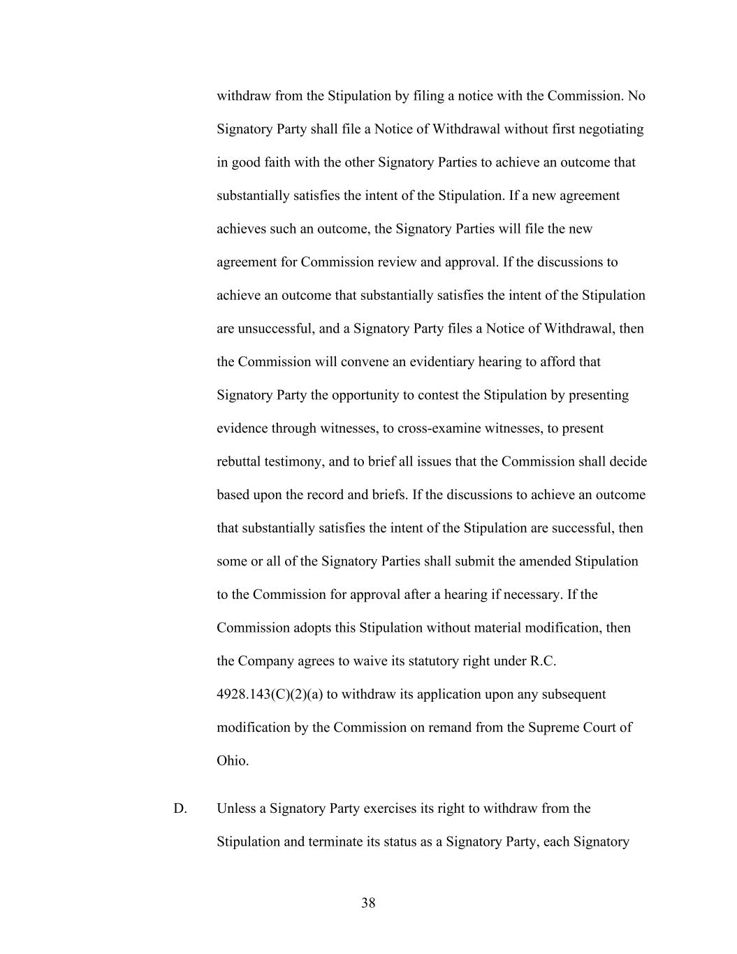 38 withdraw from the Stipulation by filing a notice with the Commission. No Signatory Party shall file a Notice of Withdrawal without first negotiating in good faith with the other Signatory Parties to achieve an outcome that substantially satisfies the intent of the Stipulation. If a new agreement achieves such an outcome, the Signatory Parties will file the new agreement for Commission review and approval. If the discussions to achieve an outcome that substantially satisfies the intent of the Stipulation are unsuccessful, and a Signatory Party files a Notice of Withdrawal, then the Commission will convene an evidentiary hearing to afford that Signatory Party the opportunity to contest the Stipulation by presenting evidence through witnesses, to cross-examine witnesses, to present rebuttal testimony, and to brief all issues that the Commission shall decide based upon the record and briefs. If the discussions to achieve an outcome that substantially satisfies the intent of the Stipulation are successful, then some or all of the Signatory Parties shall submit the amended Stipulation to the Commission for approval after a hearing if necessary. If the Commission adopts this Stipulation without material modification, then the Company agrees to waive its statutory right under R.C. 4928.143(C)(2)(a) to withdraw its application upon any subsequent modification by the Commission on remand from the Supreme Court of Ohio. D. Unless a Signatory Party exercises its right to withdraw from the Stipulation and terminate its status as a Signatory Party, each Signatory