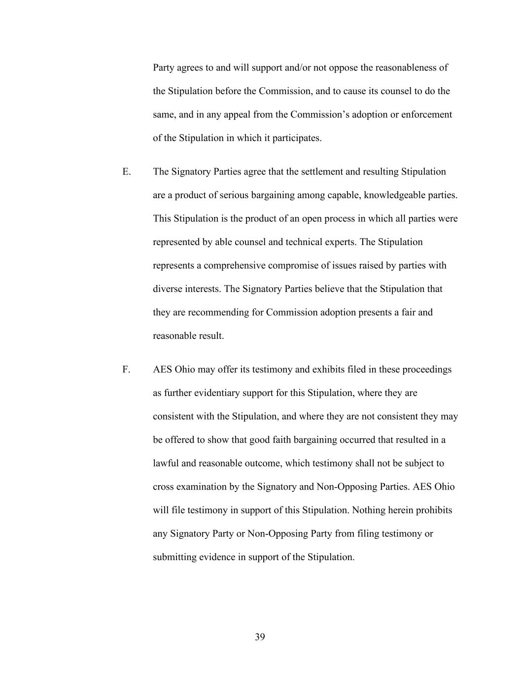 39 Party agrees to and will support and/or not oppose the reasonableness of the Stipulation before the Commission, and to cause its counsel to do the same, and in any appeal from the Commission’s adoption or enforcement of the Stipulation in which it participates. E. The Signatory Parties agree that the settlement and resulting Stipulation are a product of serious bargaining among capable, knowledgeable parties. This Stipulation is the product of an open process in which all parties were represented by able counsel and technical experts. The Stipulation represents a comprehensive compromise of issues raised by parties with diverse interests. The Signatory Parties believe that the Stipulation that they are recommending for Commission adoption presents a fair and reasonable result. F. AES Ohio may offer its testimony and exhibits filed in these proceedings as further evidentiary support for this Stipulation, where they are consistent with the Stipulation, and where they are not consistent they may be offered to show that good faith bargaining occurred that resulted in a lawful and reasonable outcome, which testimony shall not be subject to cross examination by the Signatory and Non-Opposing Parties. AES Ohio will file testimony in support of this Stipulation. Nothing herein prohibits any Signatory Party or Non-Opposing Party from filing testimony or submitting evidence in support of the Stipulation.