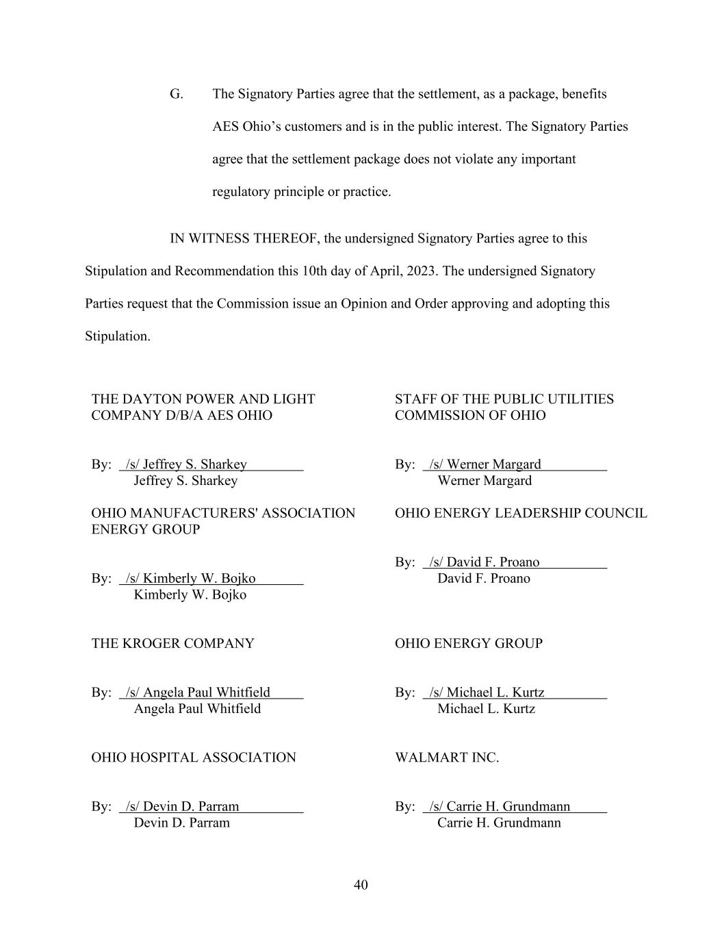40 G. The Signatory Parties agree that the settlement, as a package, benefits AES Ohio’s customers and is in the public interest. The Signatory Parties agree that the settlement package does not violate any important regulatory principle or practice. IN WITNESS THEREOF, the undersigned Signatory Parties agree to this Stipulation and Recommendation this 10th day of April, 2023. The undersigned Signatory Parties request that the Commission issue an Opinion and Order approving and adopting this Stipulation. THE DAYTON POWER AND LIGHT COMPANY D/B/A AES OHIO By: /s/ Jeffrey S. Sharkey Jeffrey S. Sharkey STAFF OF THE PUBLIC UTILITIES COMMISSION OF OHIO By: /s/ Werner Margard Werner Margard OHIO MANUFACTURERS' ASSOCIATION ENERGY GROUP By: /s/ Kimberly W. Bojko Kimberly W. Bojko OHIO ENERGY LEADERSHIP COUNCIL By: /s/ David F. Proano David F. Proano THE KROGER COMPANY By: /s/ Angela Paul Whitfield Angela Paul Whitfield OHIO ENERGY GROUP By: /s/ Michael L. Kurtz Michael L. Kurtz OHIO HOSPITAL ASSOCIATION By: /s/ Devin D. Parram Devin D. Parram WALMART INC. By: /s/ Carrie H. Grundmann Carrie H. Grundmann