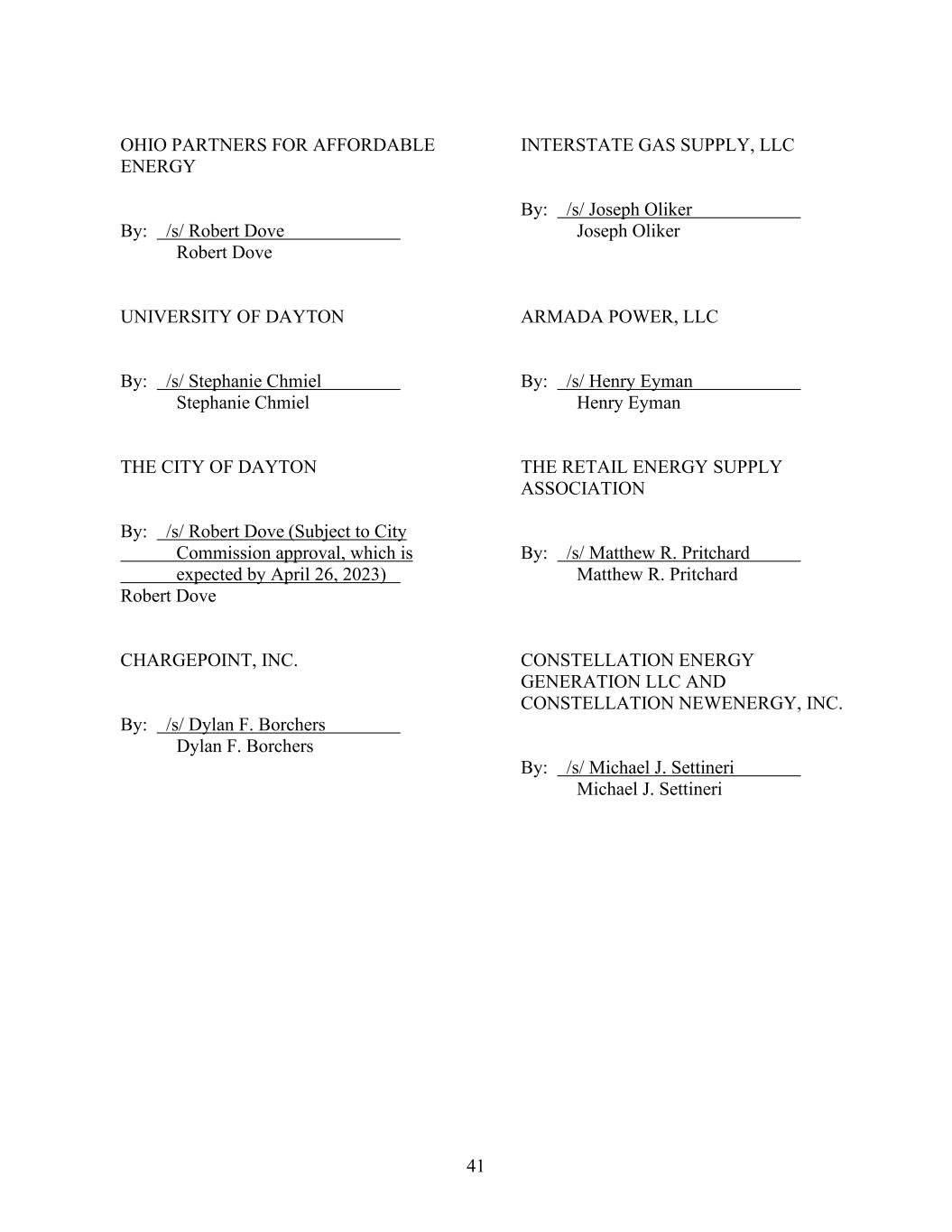 41 OHIO PARTNERS FOR AFFORDABLE ENERGY By: /s/ Robert Dove Robert Dove INTERSTATE GAS SUPPLY, LLC By: /s/ Joseph Oliker Joseph Oliker UNIVERSITY OF DAYTON By: /s/ Stephanie Chmiel Stephanie Chmiel ARMADA POWER, LLC By: /s/ Henry Eyman Henry Eyman THE CITY OF DAYTON By: /s/ Robert Dove (Subject to City Commission approval, which is expected by April 26, 2023) Robert Dove THE RETAIL ENERGY SUPPLY ASSOCIATION By: /s/ Matthew R. Pritchard Matthew R. Pritchard CHARGEPOINT, INC. By: /s/ Dylan F. Borchers Dylan F. Borchers CONSTELLATION ENERGY GENERATION LLC AND CONSTELLATION NEWENERGY, INC. By: /s/ Michael J. Settineri Michael J. Settineri