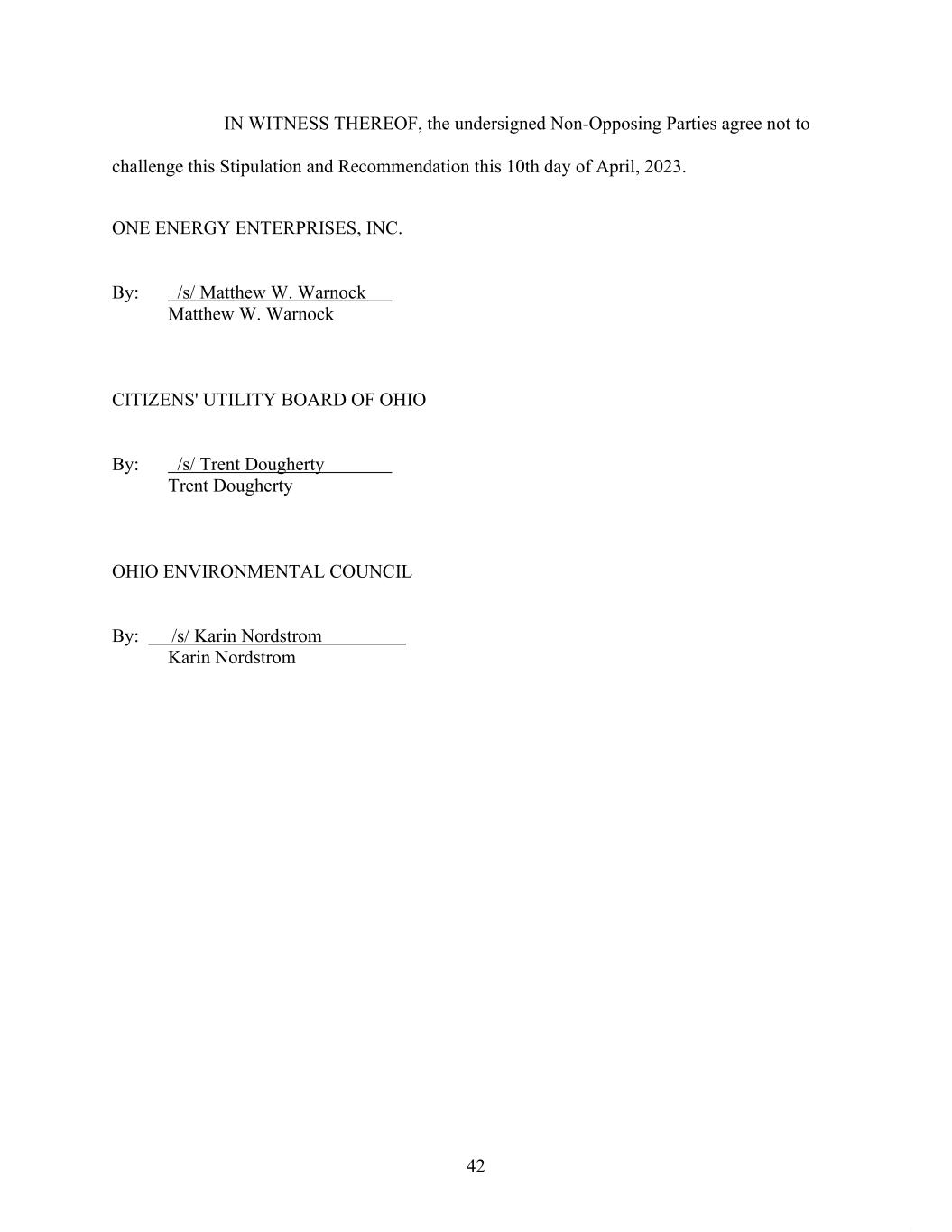 42 IN WITNESS THEREOF, the undersigned Non-Opposing Parties agree not to challenge this Stipulation and Recommendation this 10th day of April, 2023. ONE ENERGY ENTERPRISES, INC. By: /s/ Matthew W. Warnock Matthew W. Warnock CITIZENS' UTILITY BOARD OF OHIO By: /s/ Trent Dougherty Trent Dougherty OHIO ENVIRONMENTAL COUNCIL By: /s/ Karin Nordstrom Karin Nordstrom