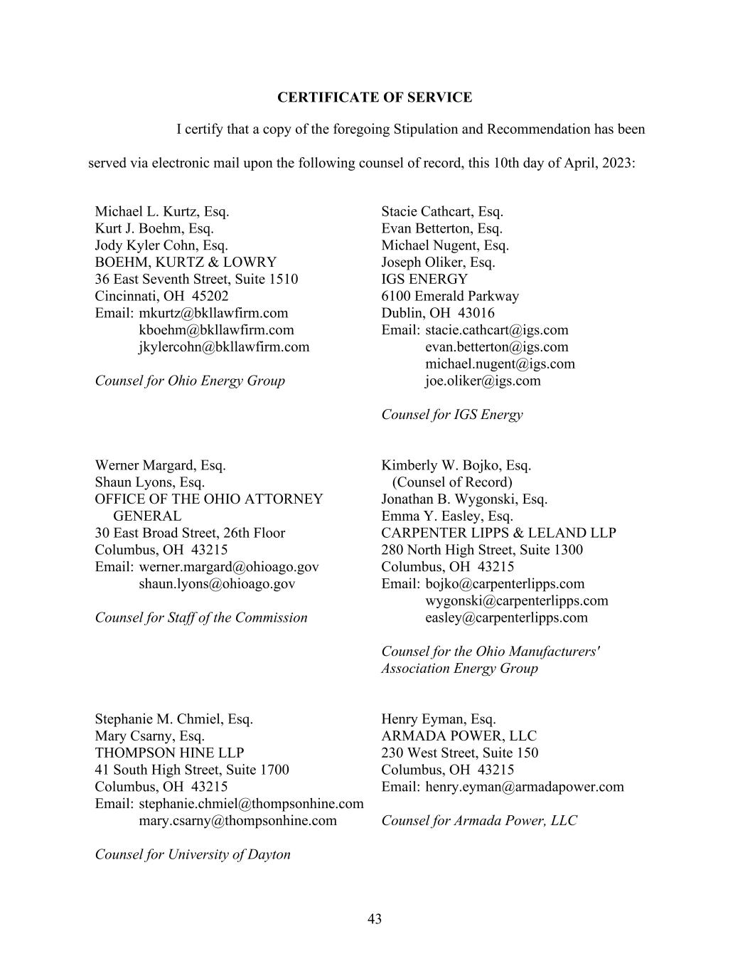 43 CERTIFICATE OF SERVICE I certify that a copy of the foregoing Stipulation and Recommendation has been served via electronic mail upon the following counsel of record, this 10th day of April, 2023: Michael L. Kurtz, Esq. Kurt J. Boehm, Esq. Jody Kyler Cohn, Esq. BOEHM, KURTZ & LOWRY 36 East Seventh Street, Suite 1510 Cincinnati, OH 45202 Email: mkurtz@bkllawfirm.com kboehm@bkllawfirm.com jkylercohn@bkllawfirm.com Counsel for Ohio Energy Group Stacie Cathcart, Esq. Evan Betterton, Esq. Michael Nugent, Esq. Joseph Oliker, Esq. IGS ENERGY 6100 Emerald Parkway Dublin, OH 43016 Email: stacie.cathcart@igs.com evan.betterton@igs.com michael.nugent@igs.com joe.oliker@igs.com Counsel for IGS Energy Werner Margard, Esq. Shaun Lyons, Esq. OFFICE OF THE OHIO ATTORNEY GENERAL 30 East Broad Street, 26th Floor Columbus, OH 43215 Email: werner.margard@ohioago.gov shaun.lyons@ohioago.gov Counsel for Staff of the Commission Kimberly W. Bojko, Esq. (Counsel of Record) Jonathan B. Wygonski, Esq. Emma Y. Easley, Esq. CARPENTER LIPPS & LELAND LLP 280 North High Street, Suite 1300 Columbus, OH 43215 Email: bojko@carpenterlipps.com wygonski@carpenterlipps.com easley@carpenterlipps.com Counsel for the Ohio Manufacturers' Association Energy Group Stephanie M. Chmiel, Esq. Mary Csarny, Esq. THOMPSON HINE LLP 41 South High Street, Suite 1700 Columbus, OH 43215 Email: stephanie.chmiel@thompsonhine.com mary.csarny@thompsonhine.com Counsel for University of Dayton Henry Eyman, Esq. ARMADA POWER, LLC 230 West Street, Suite 150 Columbus, OH 43215 Email: henry.eyman@armadapower.com Counsel for Armada Power, LLC