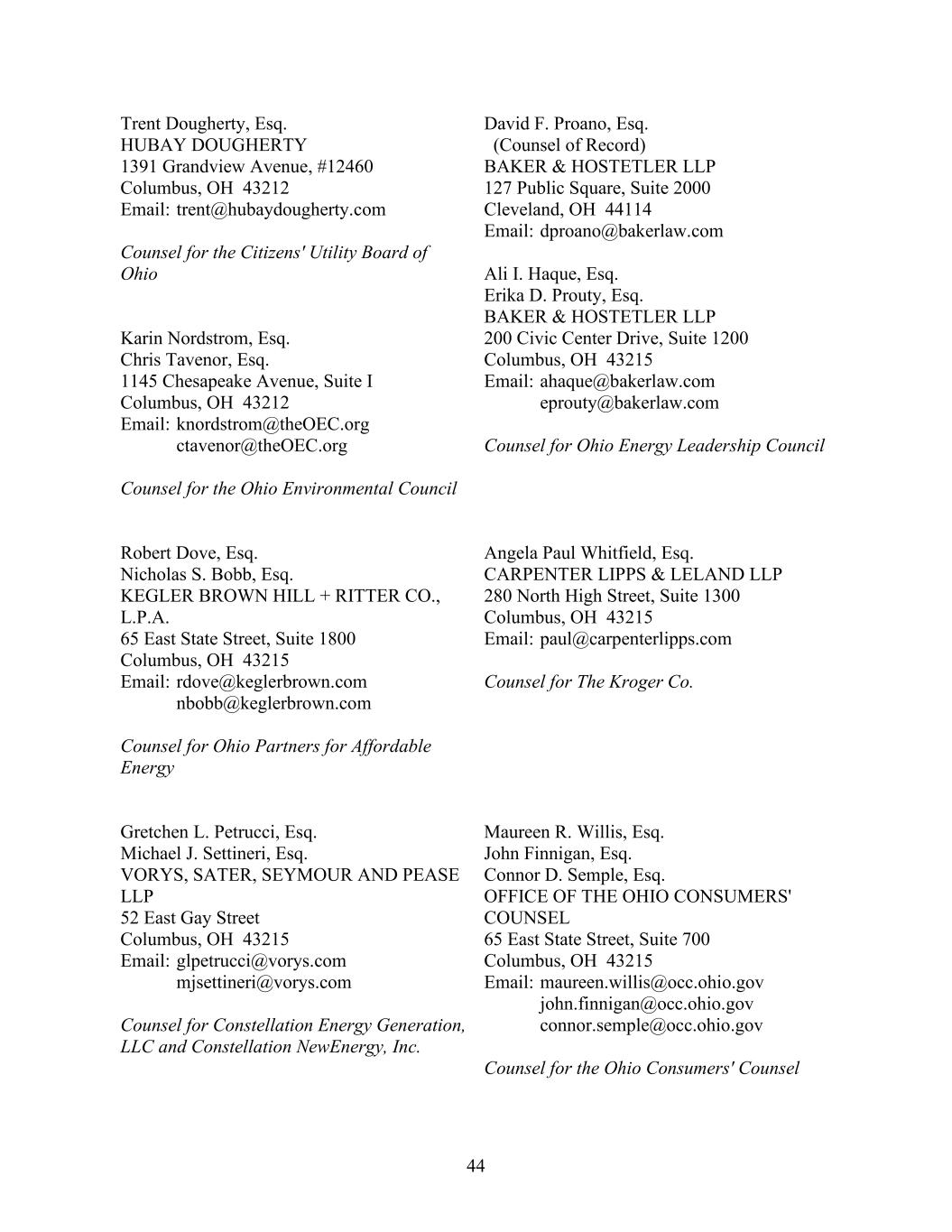 44 Trent Dougherty, Esq. HUBAY DOUGHERTY 1391 Grandview Avenue, #12460 Columbus, OH 43212 Email: trent@hubaydougherty.com Counsel for the Citizens' Utility Board of Ohio Karin Nordstrom, Esq. Chris Tavenor, Esq. 1145 Chesapeake Avenue, Suite I Columbus, OH 43212 Email: knordstrom@theOEC.org ctavenor@theOEC.org Counsel for the Ohio Environmental Council David F. Proano, Esq. (Counsel of Record) BAKER & HOSTETLER LLP 127 Public Square, Suite 2000 Cleveland, OH 44114 Email: dproano@bakerlaw.com Ali I. Haque, Esq. Erika D. Prouty, Esq. BAKER & HOSTETLER LLP 200 Civic Center Drive, Suite 1200 Columbus, OH 43215 Email: ahaque@bakerlaw.com eprouty@bakerlaw.com Counsel for Ohio Energy Leadership Council Robert Dove, Esq. Nicholas S. Bobb, Esq. KEGLER BROWN HILL + RITTER CO., L.P.A. 65 East State Street, Suite 1800 Columbus, OH 43215 Email: rdove@keglerbrown.com nbobb@keglerbrown.com Counsel for Ohio Partners for Affordable Energy Angela Paul Whitfield, Esq. CARPENTER LIPPS & LELAND LLP 280 North High Street, Suite 1300 Columbus, OH 43215 Email: paul@carpenterlipps.com Counsel for The Kroger Co. Gretchen L. Petrucci, Esq. Michael J. Settineri, Esq. VORYS, SATER, SEYMOUR AND PEASE LLP 52 East Gay Street Columbus, OH 43215 Email: glpetrucci@vorys.com mjsettineri@vorys.com Counsel for Constellation Energy Generation, LLC and Constellation NewEnergy, Inc. Maureen R. Willis, Esq. John Finnigan, Esq. Connor D. Semple, Esq. OFFICE OF THE OHIO CONSUMERS' COUNSEL 65 East State Street, Suite 700 Columbus, OH 43215 Email: maureen.willis@occ.ohio.gov john.finnigan@occ.ohio.gov connor.semple@occ.ohio.gov Counsel for the Ohio Consumers' Counsel
