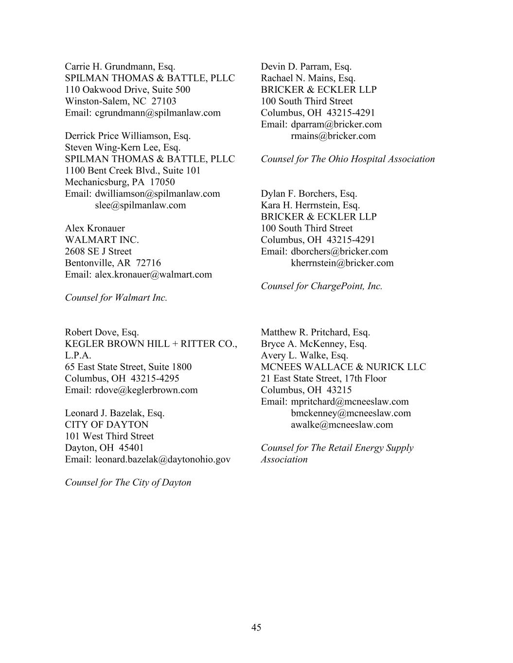 45 Carrie H. Grundmann, Esq. SPILMAN THOMAS & BATTLE, PLLC 110 Oakwood Drive, Suite 500 Winston-Salem, NC 27103 Email: cgrundmann@spilmanlaw.com Derrick Price Williamson, Esq. Steven Wing-Kern Lee, Esq. SPILMAN THOMAS & BATTLE, PLLC 1100 Bent Creek Blvd., Suite 101 Mechanicsburg, PA 17050 Email: dwilliamson@spilmanlaw.com slee@spilmanlaw.com Alex Kronauer WALMART INC. 2608 SE J Street Bentonville, AR 72716 Email: alex.kronauer@walmart.com Counsel for Walmart Inc. Devin D. Parram, Esq. Rachael N. Mains, Esq. BRICKER & ECKLER LLP 100 South Third Street Columbus, OH 43215-4291 Email: dparram@bricker.com rmains@bricker.com Counsel for The Ohio Hospital Association Dylan F. Borchers, Esq. Kara H. Herrnstein, Esq. BRICKER & ECKLER LLP 100 South Third Street Columbus, OH 43215-4291 Email: dborchers@bricker.com kherrnstein@bricker.com Counsel for ChargePoint, Inc. Robert Dove, Esq. KEGLER BROWN HILL + RITTER CO., L.P.A. 65 East State Street, Suite 1800 Columbus, OH 43215-4295 Email: rdove@keglerbrown.com Leonard J. Bazelak, Esq. CITY OF DAYTON 101 West Third Street Dayton, OH 45401 Email: leonard.bazelak@daytonohio.gov Counsel for The City of Dayton Matthew R. Pritchard, Esq. Bryce A. McKenney, Esq. Avery L. Walke, Esq. MCNEES WALLACE & NURICK LLC 21 East State Street, 17th Floor Columbus, OH 43215 Email: mpritchard@mcneeslaw.com bmckenney@mcneeslaw.com awalke@mcneeslaw.com Counsel for The Retail Energy Supply Association