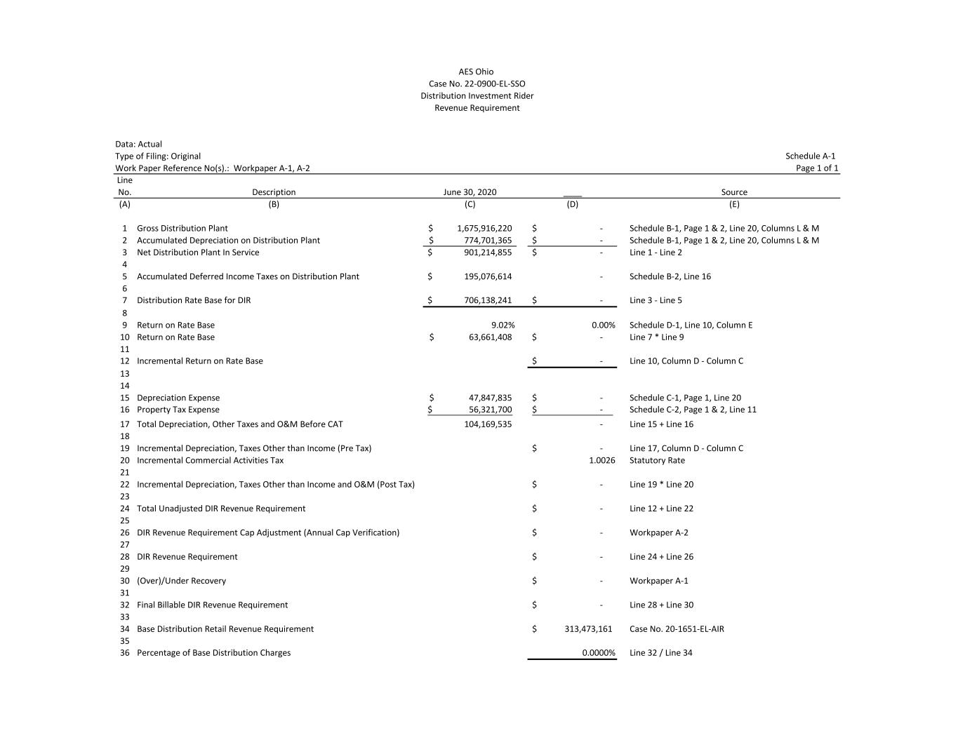 Data: Actual Type of Filing: Original Schedule A-1 Work Paper Reference No(s).: Workpaper A-1, A-2 Page 1 of 1 Line No. Description June 30, 2020 ____ Source (A) (B) (C) (D) (E) 1 Gross Distribution Plant 1,675,916,220$ -$ Schedule B-1, Page 1 & 2, Line 20, Columns L & M 2 Accumulated Depreciation on Distribution Plant 774,701,365$ -$ Schedule B-1, Page 1 & 2, Line 20, Columns L & M 3 Net Distribution Plant In Service 901,214,855$ -$ Line 1 - Line 2 4 5 Accumulated Deferred Income Taxes on Distribution Plant 195,076,614$ - Schedule B-2, Line 16 6 7 Distribution Rate Base for DIR 706,138,241$ -$ Line 3 - Line 5 8 9 Return on Rate Base 9.02% 0.00% Schedule D-1, Line 10, Column E 10 Return on Rate Base 63,661,408$ -$ Line 7 * Line 9 11 12 Incremental Return on Rate Base -$ Line 10, Column D - Column C 13 14 15 Depreciation Expense 47,847,835$ -$ Schedule C-1, Page 1, Line 20 16 Property Tax Expense 56,321,700$ -$ Schedule C-2, Page 1 & 2, Line 11 17 Total Depreciation, Other Taxes and O&M Before CAT 104,169,535 - Line 15 + Line 16 18 19 Incremental Depreciation, Taxes Other than Income (Pre Tax) -$ Line 17, Column D - Column C 20 Incremental Commercial Activities Tax 1.0026 Statutory Rate 21 22 Incremental Depreciation, Taxes Other than Income and O&M (Post Tax) -$ Line 19 * Line 20 23 24 Total Unadjusted DIR Revenue Requirement -$ Line 12 + Line 22 25 26 DIR Revenue Requirement Cap Adjustment (Annual Cap Verification) -$ Workpaper A-2 27 28 DIR Revenue Requirement -$ Line 24 + Line 26 29 30 (Over)/Under Recovery -$ Workpaper A-1 31 32 Final Billable DIR Revenue Requirement -$ Line 28 + Line 30 33 34 Base Distribution Retail Revenue Requirement 313,473,161$ Case No. 20-1651-EL-AIR 35 36 Percentage of Base Distribution Charges 0.0000% Line 32 / Line 34 AES Ohio Case No. 22-0900-EL-SSO Distribution Investment Rider Revenue Requirement