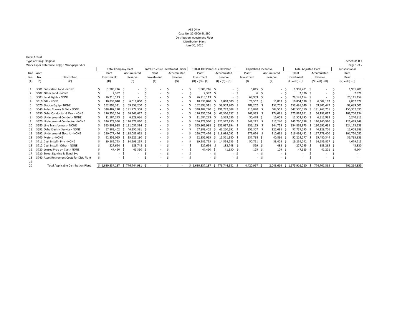 Data: Actual Type of Filing: Original Schedule B-1 Work Paper Reference No(s).: Workpaper A-3 Page 1 of 2 Jurisdictional Line Acct. Plant Accumulated Plant Accumulated Plant Accumulated Plant Accumulated Plant Accumulated Rate No. No. Description Investment Reserve Investment Reserve Investment Reserve Investment Reserve Investment Reserve Base (A) (B) (C) (D) (E) (F) (G) (H) = (D) - (F) (I) = (E) - (G) (J) (K) (L) = (H) - (J) (M) = (I) - (K) (N) = (H) - (I) 1 3601 Substation Land - NONE 1,906,216$ -$ -$ -$ 1,906,216$ -$ 5,015$ -$ 1,901,201$ -$ 1,901,201$ 2 3602 Other Land - NONE 2,382$ -$ -$ -$ 2,382$ -$ 6$ -$ 2,376$ -$ 2,376$ 3 3603 Land Rights - NONE 26,210,113$ -$ -$ -$ 26,210,113$ -$ 68,959$ -$ 26,141,154$ -$ 26,141,154$ 4 3610 S&I - NONE 10,833,040$ 6,018,000$ -$ -$ 10,833,040$ 6,018,000$ 28,502$ 15,833$ 10,804,538$ 6,002,167$ 4,802,372$ 5 3620 Station Equip - NONE 152,893,311$ 59,959,200$ -$ -$ 152,893,311$ 59,959,200$ 402,262$ 157,753$ 152,491,049$ 59,801,447$ 92,689,601$ 6 3640 Poles, Towers & Fixt - NONE 348,487,220$ 191,772,308$ -$ -$ 348,487,220$ 191,772,308$ 916,870$ 504,553$ 347,570,350$ 191,267,755$ 156,302,595$ 7 3650 Ovhd Conductor & Dev - NONE 176,356,254$ 66,366,637$ -$ -$ 176,356,254$ 66,366,637$ 463,993$ 174,611$ 175,892,261$ 66,192,027$ 109,700,234$ 8 3660 Underground Conduit - NONE 11,584,273$ 6,329,636$ -$ -$ 11,584,273$ 6,329,636$ 30,478$ 16,653$ 11,553,795$ 6,312,983$ 5,240,812$ 9 3670 Underground Conductor - NONE 246,378,560$ 120,577,830$ -$ -$ 246,378,560$ 120,577,830$ 648,222$ 317,240$ 245,730,338$ 120,260,590$ 125,469,748$ 10 3680 Line Transformers - NONE 355,801,988$ 131,037,394$ -$ -$ 355,801,988$ 131,037,394$ 936,115$ 344,759$ 354,865,873$ 130,692,635$ 224,173,238$ 11 3691 Ovhd Electric Service - NONE 57,889,402$ 46,250,391$ -$ -$ 57,889,402$ 46,250,391$ 152,307$ 121,685$ 57,737,095$ 46,128,706$ 11,608,389$ 12 3692 Underground Electric - NONE 220,077,476$ 118,089,092$ -$ -$ 220,077,476$ 118,089,092$ 579,024$ 310,692$ 219,498,452$ 117,778,400$ 101,720,052$ 13 3700 Meters - NONE 52,352,015$ 15,521,180$ -$ -$ 52,352,015$ 15,521,180$ 137,738$ 40,836$ 52,214,277$ 15,480,344$ 36,733,933$ 14 3711 Cust Install - Priv - NONE 19,289,793$ 14,598,235$ -$ -$ 19,289,793$ 14,598,235$ 50,751$ 38,408$ 19,239,042$ 14,559,827$ 4,679,215$ 15 3712 Cust Install - Other - NONE 227,694$ 183,748$ -$ -$ 227,694$ 183,748$ 599$ 483$ 227,095$ 183,265$ 43,830$ 16 3720 Leased Prop on Cust - NONE 47,450$ 41,330$ -$ -$ 47,450$ 41,330$ 125$ 109$ 47,325$ 41,221$ 6,104$ 17 3730 Street Lighting & Signal Sys -$ -$ -$ -$ -$ -$ -$ -$ -$ -$ -$ 18 3740 Asset Retirement Costs for Dist. Plant -$ -$ -$ -$ -$ -$ -$ -$ -$ -$ -$ 19 20 Total Applicable Distribution Plant 1,680,337,187$ 776,744,981$ -$ -$ 1,680,337,187$ 776,744,981$ 4,420,967$ 2,043,616$ 1,675,916,220$ 774,701,365$ 901,214,855$ AES Ohio Case No. 22-0900-EL-SSO Distribution Investment Rider Total Company Plant Total Adjusted Plant June 30, 2020 Distribution Plant Infrastructure Investment Rider TOTAL DIR Plant Less: IIR Plant Capitalized Incentive