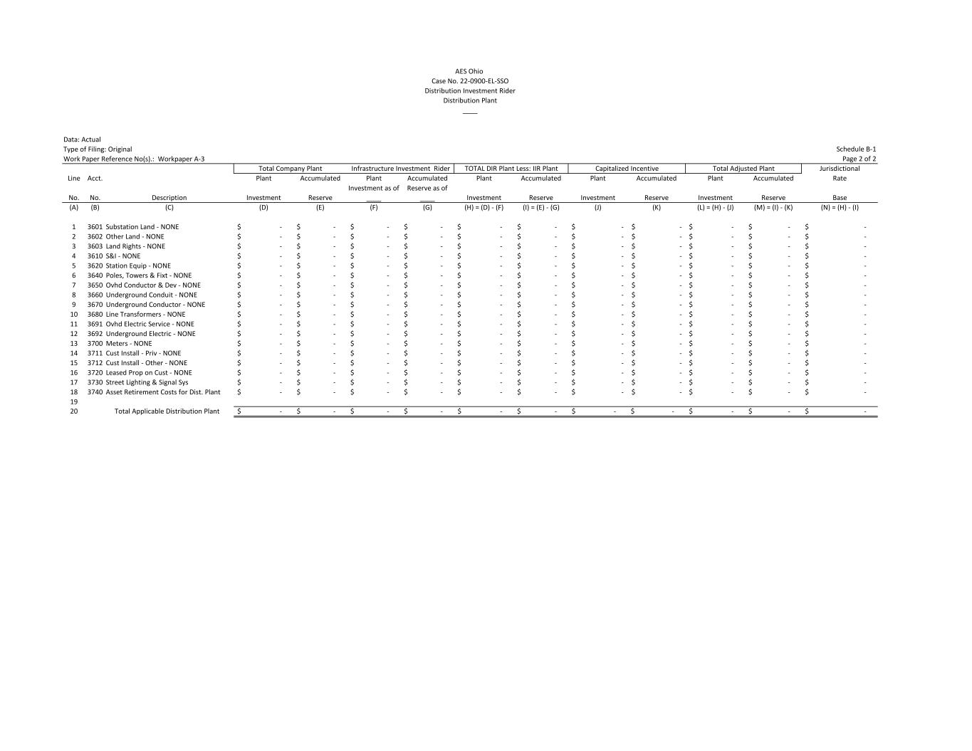 Data: Actual Type of Filing: Original Schedule B-1 Work Paper Reference No(s).: Workpaper A-3 Page 2 of 2 Jurisdictional Line Acct. Plant Accumulated Plant Accumulated Plant Accumulated Plant Accumulated Plant Accumulated Rate No. No. Description Investment Reserve Investment as of ____ Reserve as of ____ Investment Reserve Investment Reserve Investment Reserve Base (A) (B) (C) (D) (E) (F) (G) (H) = (D) - (F) (I) = (E) - (G) (J) (K) (L) = (H) - (J) (M) = (I) - (K) (N) = (H) - (I) 1 3601 Substation Land - NONE -$ -$ -$ -$ -$ -$ -$ -$ -$ -$ -$ 2 3602 Other Land - NONE -$ -$ -$ -$ -$ -$ -$ -$ -$ -$ -$ 3 3603 Land Rights - NONE -$ -$ -$ -$ -$ -$ -$ -$ -$ -$ -$ 4 3610 S&I - NONE -$ -$ -$ -$ -$ -$ -$ -$ -$ -$ -$ 5 3620 Station Equip - NONE -$ -$ -$ -$ -$ -$ -$ -$ -$ -$ -$ 6 3640 Poles, Towers & Fixt - NONE -$ -$ -$ -$ -$ -$ -$ -$ -$ -$ -$ 7 3650 Ovhd Conductor & Dev - NONE -$ -$ -$ -$ -$ -$ -$ -$ -$ -$ -$ 8 3660 Underground Conduit - NONE -$ -$ -$ -$ -$ -$ -$ -$ -$ -$ -$ 9 3670 Underground Conductor - NONE -$ -$ -$ -$ -$ -$ -$ -$ -$ -$ -$ 10 3680 Line Transformers - NONE -$ -$ -$ -$ -$ -$ -$ -$ -$ -$ -$ 11 3691 Ovhd Electric Service - NONE -$ -$ -$ -$ -$ -$ -$ -$ -$ -$ -$ 12 3692 Underground Electric - NONE -$ -$ -$ -$ -$ -$ -$ -$ -$ -$ -$ 13 3700 Meters - NONE -$ -$ -$ -$ -$ -$ -$ -$ -$ -$ -$ 14 3711 Cust Install - Priv - NONE -$ -$ -$ -$ -$ -$ -$ -$ -$ -$ -$ 15 3712 Cust Install - Other - NONE -$ -$ -$ -$ -$ -$ -$ -$ -$ -$ -$ 16 3720 Leased Prop on Cust - NONE -$ -$ -$ -$ -$ -$ -$ -$ -$ -$ -$ 17 3730 Street Lighting & Signal Sys -$ -$ -$ -$ -$ -$ -$ -$ -$ -$ -$ 18 3740 Asset Retirement Costs for Dist. Plant -$ -$ -$ -$ -$ -$ -$ -$ -$ -$ -$ 19 20 Total Applicable Distribution Plant -$ -$ -$ -$ -$ -$ -$ -$ -$ -$ -$ Distribution Investment Rider AES Ohio Case No. 22-0900-EL-SSO ____ Infrastructure Investment Rider TOTAL DIR Plant Less: IIR Plant Capitalized Incentive Distribution Plant Total Company Plant Total Adjusted Plant