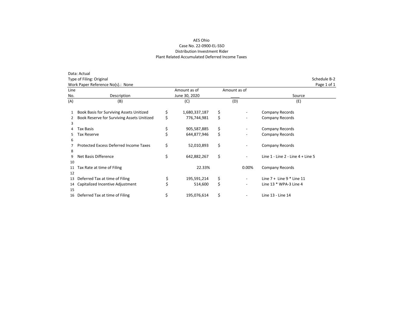 Data: Actual Type of Filing: Original Schedule B-2 Work Paper Reference No(s).: None Page 1 of 1 Line Amount as of Amount as of No. Description June 30, 2020 ____ Source (A) (B) (C) (D) (E) 1 Book Basis for Surviving Assets Unitized 1,680,337,187$ -$ Company Records 2 Book Reserve for Surviving Assets Unitized 776,744,981$ -$ Company Records 3 4 Tax Basis 905,587,885$ -$ Company Records 5 Tax Reserve 644,877,946$ -$ Company Records 6 7 Protected Excess Deferred Income Taxes 52,010,893$ -$ Company Records 8 9 Net Basis Difference 642,882,267$ -$ Line 1 - Line 2 - Line 4 + Line 5 10 11 Tax Rate at time of Filing 22.33% 0.00% Company Records 12 13 Deferred Tax at time of Filing 195,591,214$ -$ Line 7 + Line 9 * Line 11 14 Capitalized Incentive Adjustment 514,600$ -$ Line 13 * WPA-3 Line 4 15 16 Deferred Tax at time of Filing 195,076,614$ -$ Line 13 - Line 14 AES Ohio Case No. 22-0900-EL-SSO Distribution Investment Rider Plant Related Accumulated Deferred Income Taxes