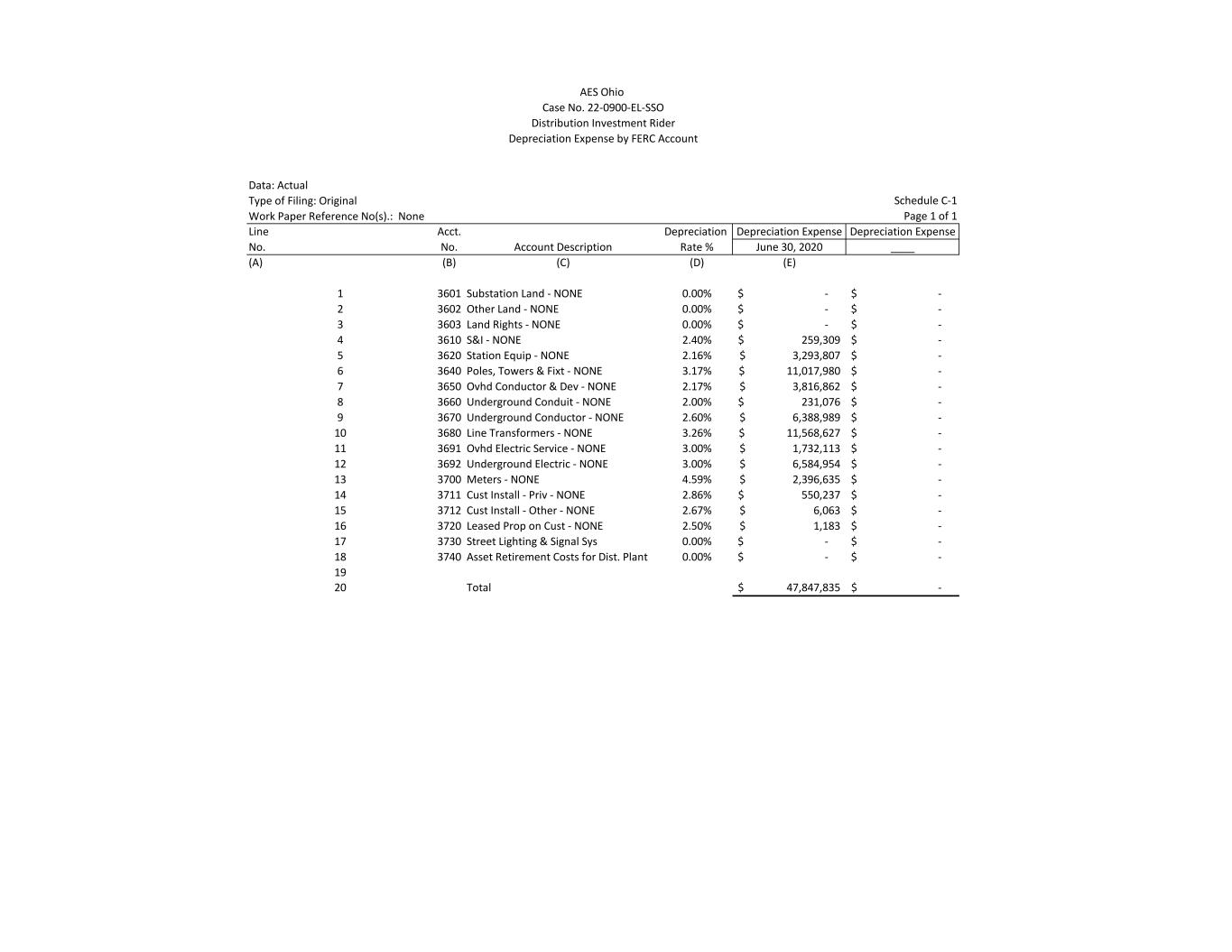 Data: Actual Type of Filing: Original Schedule C-1 Work Paper Reference No(s).: None Page 1 of 1 Line Acct. Depreciation Depreciation Expense Depreciation Expense No. No. Account Description Rate % June 30, 2020 ____ (A) (B) (C) (D) (E) 1 3601 Substation Land - NONE 0.00% -$ -$ 2 3602 Other Land - NONE 0.00% -$ -$ 3 3603 Land Rights - NONE 0.00% -$ -$ 4 3610 S&I - NONE 2.40% 259,309$ -$ 5 3620 Station Equip - NONE 2.16% 3,293,807$ -$ 6 3640 Poles, Towers & Fixt - NONE 3.17% 11,017,980$ -$ 7 3650 Ovhd Conductor & Dev - NONE 2.17% 3,816,862$ -$ 8 3660 Underground Conduit - NONE 2.00% 231,076$ -$ 9 3670 Underground Conductor - NONE 2.60% 6,388,989$ -$ 10 3680 Line Transformers - NONE 3.26% 11,568,627$ -$ 11 3691 Ovhd Electric Service - NONE 3.00% 1,732,113$ -$ 12 3692 Underground Electric - NONE 3.00% 6,584,954$ -$ 13 3700 Meters - NONE 4.59% 2,396,635$ -$ 14 3711 Cust Install - Priv - NONE 2.86% 550,237$ -$ 15 3712 Cust Install - Other - NONE 2.67% 6,063$ -$ 16 3720 Leased Prop on Cust - NONE 2.50% 1,183$ -$ 17 3730 Street Lighting & Signal Sys 0.00% -$ -$ 18 3740 Asset Retirement Costs for Dist. Plant 0.00% -$ -$ 19 20 Total 47,847,835$ -$ AES Ohio Case No. 22-0900-EL-SSO Distribution Investment Rider Depreciation Expense by FERC Account