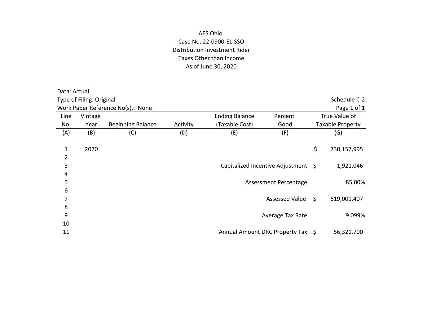 Data: Actual Type of Filing: Original Schedule C-2 Work Paper Reference No(s).: None Page 1 of 1 Line Vintage Ending Balance Percent True Value of No. Year Beginning Balance Activity (Taxable Cost) Good Taxable Property (A) (B) (C) (D) (E) (F) (G) 1 2020 730,157,995$ 2 3 Capitalized Incentive Adjustment 1,921,046$ 4 5 Assessment Percentage 85.00% 6 7 Assessed Value 619,001,407$ 8 9 Average Tax Rate 9.099% 10 11 Annual Amount DRC Property Tax 56,321,700$ AES Ohio Case No. 22-0900-EL-SSO Distribution Investment Rider Taxes Other than Income As of June 30, 2020