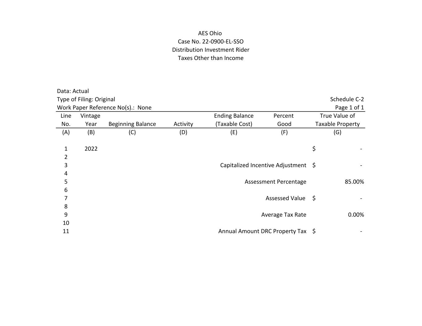 Data: Actual Type of Filing: Original Schedule C-2 Work Paper Reference No(s).: None Page 1 of 1 Line Vintage Ending Balance Percent True Value of No. Year Beginning Balance Activity (Taxable Cost) Good Taxable Property (A) (B) (C) (D) (E) (F) (G) 1 2022 -$ 2 3 Capitalized Incentive Adjustment -$ 4 5 Assessment Percentage 85.00% 6 7 Assessed Value -$ 8 9 Average Tax Rate 0.00% 10 11 Annual Amount DRC Property Tax -$ AES Ohio Case No. 22-0900-EL-SSO Distribution Investment Rider Taxes Other than Income