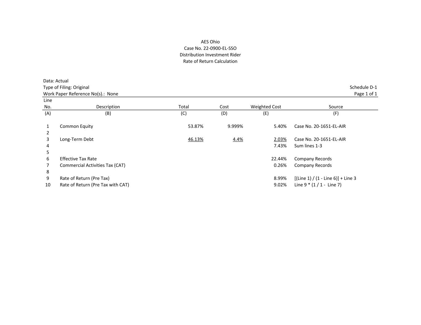 Data: Actual Type of Filing: Original Schedule D-1 Work Paper Reference No(s).: None Page 1 of 1 Line No. Description Total Cost Weighted Cost Source (A) (B) (C) (D) (E) (F) 1 Common Equity 53.87% 9.999% 5.40% Case No. 20-1651-EL-AIR 2 3 Long-Term Debt 46.13% 4.4% 2.03% Case No. 20-1651-EL-AIR 4 7.43% Sum lines 1-3 5 6 Effective Tax Rate 22.44% Company Records 7 Commercial Activities Tax (CAT) 0.26% Company Records 8 9 Rate of Return (Pre Tax) 8.99% [(Line 1) / (1 - Line 6)] + Line 3 10 Rate of Return (Pre Tax with CAT) 9.02% Line 9 * (1 / 1 - Line 7) AES Ohio Case No. 22-0900-EL-SSO Distribution Investment Rider Rate of Return Calculation