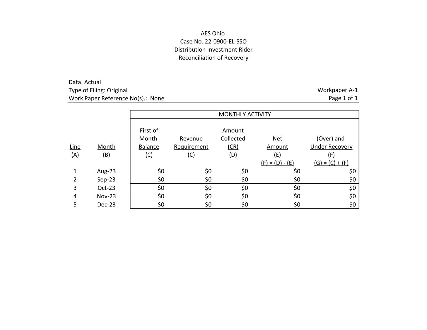 Data: Actual Type of Filing: Original Workpaper A-1 Work Paper Reference No(s).: None Page 1 of 1 First of Amount Month Revenue Collected Net (Over) and Line Month Balance Requirement (CR) Amount Under Recovery (A) (B) (C) (C) (D) (E) (F) (F) = (D) - (E) (G) = (C) + (F) 1 Aug-23 $0 $0 $0 $0 $0 2 Sep-23 $0 $0 $0 $0 $0 3 Oct-23 $0 $0 $0 $0 $0 4 Nov-23 $0 $0 $0 $0 $0 5 Dec-23 $0 $0 $0 $0 $0 MONTHLY ACTIVITY AES Ohio Case No. 22-0900-EL-SSO Distribution Investment Rider Reconciliation of Recovery