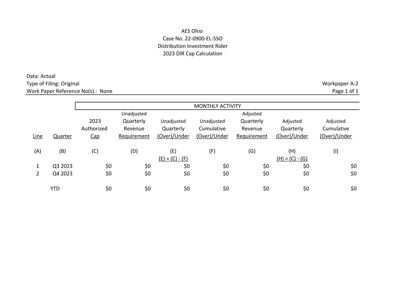 Data: Actual Type of Filing: Original Workpaper A-2 Work Paper Reference No(s).: None Page 1 of 1 Unadjusted Adjusted 2023 Quarterly Unadjusted Unadjusted Quarterly Adjusted Adjusted Authorized Revenue Quarterly Cumulative Revenue Quarterly Cumulative Line Quarter Cap Requirement (Over)/Under (Over)/Under Requirement (Over)/Under (Over)/Under (A) (B) (C) (D) (E) (F) (G) (H) (I) (E) = (C) - (F) (H) = (C) - (G) 1 Q3 2023 $0 $0 $0 $0 $0 $0 $0 2 Q4 2023 $0 $0 $0 $0 $0 $0 $0 YTD $0 $0 $0 $0 $0 $0 $0 AES Ohio Case No. 22-0900-EL-SSO Distribution Investment Rider 2023 DIR Cap Calculation MONTHLY ACTIVITY