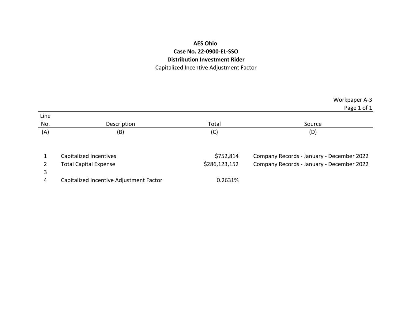 Workpaper A-3 Page 1 of 1 Line No. Description Total Source (A) (B) (C) (D) 1 Capitalized Incentives $752,814 Company Records - January - December 2022 2 Total Capital Expense $286,123,152 Company Records - January - December 2022 3 4 Capitalized Incentive Adjustment Factor 0.2631% AES Ohio Case No. 22-0900-EL-SSO Capitalized Incentive Adjustment Factor Distribution Investment Rider