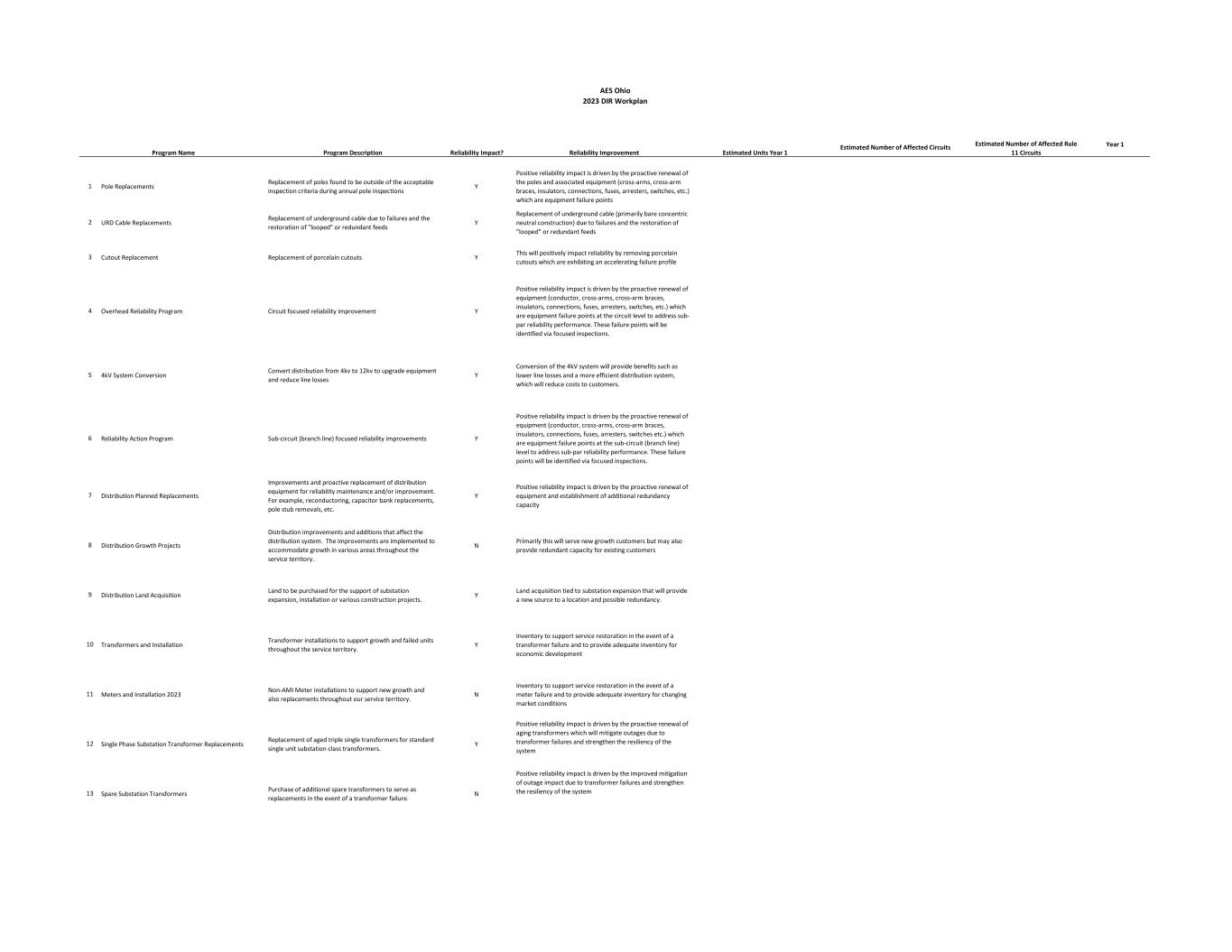 Year 1 Program Description Reliability Impact? Reliability Improvement Estimated Units Year 1 1 Pole Replacements Replacement of poles found to be outside of the acceptable inspection criteria during annual pole inspections Y Positive reliability impact is driven by the proactive renewal of the poles and associated equipment (cross-arms, cross-arm braces, insulators, connections, fuses, arresters, switches, etc.) which are equipment failure points 2 URD Cable Replacements Replacement of underground cable due to failures and the restoration of "looped" or redundant feeds Y Replacement of underground cable (primarily bare concentric neutral construction) due to failures and the restoration of "looped" or redundant feeds 3 Cutout Replacement Replacement of porcelain cutouts Y This will positively impact reliability by removing porcelain cutouts which are exhibiting an accelerating failure profile 4 Overhead Reliability Program Circuit focused reliability improvement Y Positive reliability impact is driven by the proactive renewal of equipment (conductor, cross-arms, cross-arm braces, insulators, connections, fuses, arresters, switches, etc.) which are equipment failure points at the circuit level to address sub- par reliability performance. These failure points will be identified via focused inspections. 5 4kV System Conversion Convert distribution from 4kv to 12kv to upgrade equipment and reduce line losses Y Conversion of the 4kV system will provide benefits such as lower line losses and a more efficient distribution system, which will reduce costs to customers. 6 Reliability Action Program Sub-circuit (branch line) focused reliability improvements Y Positive reliability impact is driven by the proactive renewal of equipment (conductor, cross-arms, cross-arm braces, insulators, connections, fuses, arresters, switches etc.) which are equipment failure points at the sub-circuit (branch line) level to address sub-par reliability performance. These failure points will be identified via focused inspections. 7 Distribution Planned Replacements Improvements and proactive replacement of distribution equipment for reliability maintenance and/or improvement. For example, reconductoring, capacitor bank replacements, pole stub removals, etc. Y Positive reliability impact is driven by the proactive renewal of equipment and establishment of additional redundancy capacity 8 Distribution Growth Projects Distribution improvements and additions that affect the distribution system. The improvements are implemented to accommodate growth in various areas throughout the service territory. N Primarily this will serve new growth customers but may also provide redundant capacity for existing customers 9 Distribution Land Acquisition Land to be purchased for the support of substation expansion, installation or various construction projects. Y Land acquisition tied to substation expansion that will provide a new source to a location and possible redundancy. 10 Transformers and Installation Transformer installations to support growth and failed units throughout the service territory. Y Inventory to support service restoration in the event of a transformer failure and to provide adequate inventory for economic development 11 Meters and Installation 2023 Non-AMI Meter installations to support new growth and also replacements throughout our service territory. N Inventory to support service restoration in the event of a meter failure and to provide adequate inventory for changing market conditions 12 Single Phase Substation Transformer Replacements Replacement of aged triple single transformers for standard single unit substation class transformers. Y Positive reliability impact is driven by the proactive renewal of aging transformers which will mitigate outages due to transformer failures and strengthen the resiliency of the system 13 Spare Substation Transformers Purchase of additional spare transformers to serve as replacements in the event of a transformer failure. N Positive reliability impact is driven by the improved mitigation of outage impact due to transformer failures and strengthen the resiliency of the system AES Ohio 2023 DIR Workplan Estimated Number of Affected Rule 11 Circuits Estimated Number of Affected Circuits Program Name