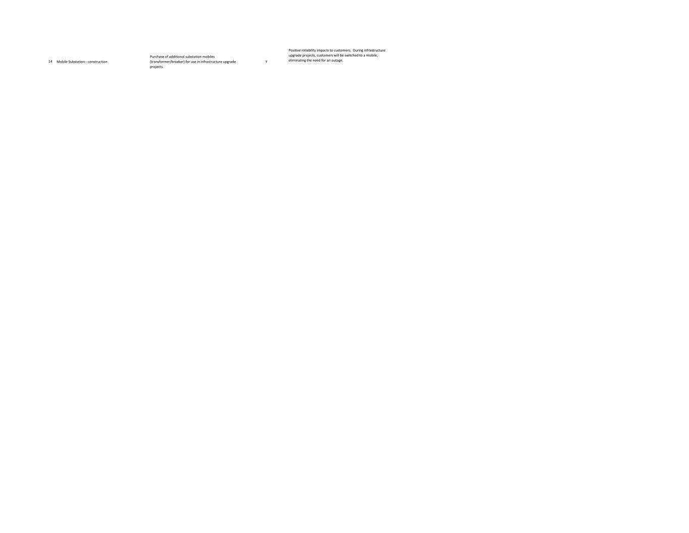 14 Mobile Substation - construction Purchase of additional substation mobiles (transformer/breaker) for use in infrastructure upgrade projects. Y Positive reliability impacts to customers. During infrastructure upgrade projects, customers will be switched to a mobile, eliminating the need for an outage.