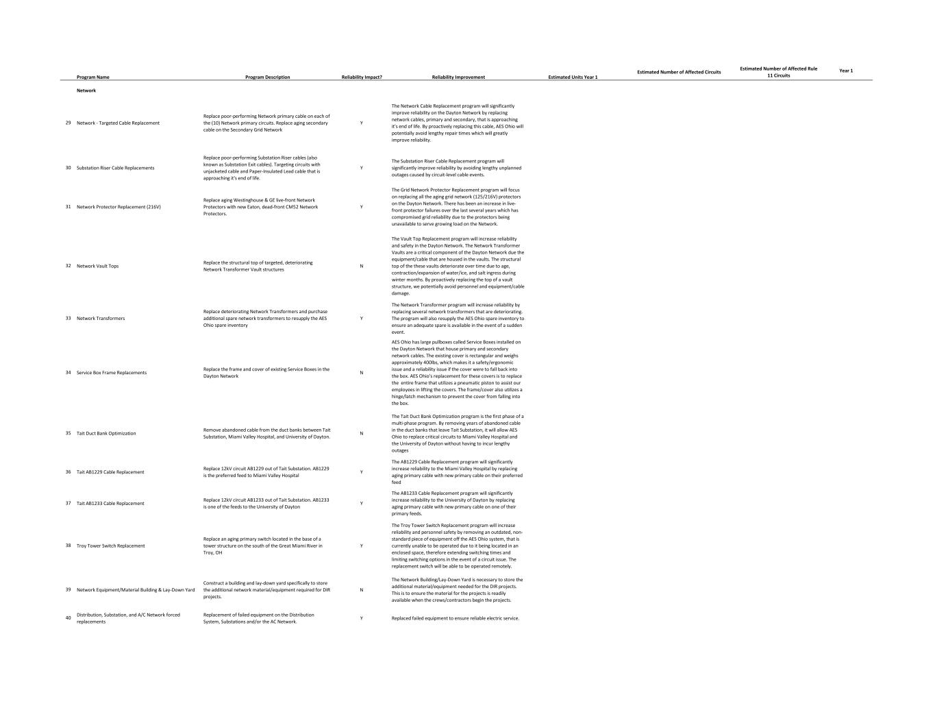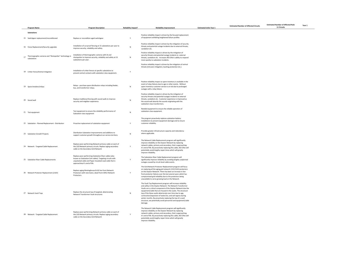 Year 1 Program Name Program Description Reliability Impact? Reliability Improvement Estimated Units Year 1 Substations 15 Switchgear replacement/reconditioned Replace or recondition aged switchgear. Y Positive reliability impact is driven by the focused replacement of equipment exhibiting heightened failure profiles 16 Fence Replacement/Security upgrades Installation of cut proof fencing at 15 substations per year to improve security, reliability and safety. N Positive reliability impact is driven by the mitigation of security threats and potential outage incidents due to external threats, vandalism etc. 17 Thermographic cameras and "Shotspotter" technology in substations Installation of thermographic cameras with AI and shotspotter to improve security, reliability and safety at 15 substations per year. N Positive reliability impacts is driven by the mitigation of security threats and potential outage incidents to external threats, vandalism etc. Increases AES Ohio's ability to respond more quickly to substation incidents. 18 Critter Fence/Animal mitigation Installation of critter fences at specific substations to prevent animal contacts with substation class equipment. Y Positive reliability impact is driven by the mitigation of animal threats (intrusion mitigation, bushing protection etc.). 19 Spare breakers/relays Relays - purchase spare distribution relays including feeder, bus, and transformer relays. N Positive reliability impact so spare inventory is available in the event of relay failures due to age or other events. Without spare inventory customer service is at risk due to prolonged outages with a relay failure. 20 Sound wall Replace traditional fencing with sound walls to improve security and neighbor experience. N Positive reliability impacts is driven by the mitigation of security threats and potential outages incidents to external threats, vandalism etc. Customer experience is improved as the sound wall absorbs the sounds originating with the substation class transformers. 21 Test equipment Test equipment to ensure the reliability performance of Substation class equipment N Needed equipment to ensure the reliable operation of substation class equipment. 22 Substation - Planned Replacement - Distribution Proactive replacement of substation equipment Y The program proactively replaces substation battery installations to prevent equipment damage and to ensure customer reliability. 23 Substation Growth Projects Distribution Substation improvements and additions to support customer growth throughout our service territory. N Provides greater infrastructure capacity and redundancy where applicable. 24 Network - Targeted Cable Replacement Replace poor-performing Network primary cable on each of the (10) Network primary circuits. Replace aging secondary cable on the Secondary Grid Network Y The Network Cable Replacement program will significantly improve reliability on the Dayton Network by replacing network cables, primary and secondary, that is approaching it's end of life. By proactively replacing this cable, AES Ohio will potentially avoid lengthy repair times which will greatly improve reliability. 25 Substation Riser Cable Replacements Replace poor-performing Substation Riser cables (also known as Substation Exit cables). Targeting circuits with unjacketed cable and Paper-Insulated Lead cable that is approaching it's end of life. Y The Substation Riser Cable Replacement program will significantly improve reliability by avoiding lengthy unplanned outages caused by circuit-level cable events. 26 Network Protector Replacement (216V) Replace aging Westinghouse & GE live-front Network Protectors with new Eaton, dead-front CM52 Network Protectors. Y The Grid Network Protector Replacement program will focus on replacing all the aging grid network (125/216V) protectors on the Dayton Network. There has been an increase in live- front protector failures over the last several years which has compromised grid reliability due to the protectors being unavailable to serve growing load on the Network. 27 Network Vault Tops Replace the structural top of targeted, deteriorating Network Transformer Vault structures N The Vault Top Replacement program will increase reliability and safety in the Dayton Network. The Network Transformer Vaults are a critical component of the Dayton Network due the equipment/cable that are housed in the vaults. The structural top of the these vaults deteriorate over time due to age, contraction/expansion of water/ice, and salt ingress during winter months. By proactively replacing the top of a vault structure, we potentially avoid personnel and equipment/cable damage. 28 Network - Targeted Cable Replacement Replace poor-performing Network primary cable on each of the (10) Network primary circuits. Replace aging secondary cable on the Secondary Grid Network Y The Network Cable Replacement program will significantly improve reliability on the Dayton Network by replacing network cables, primary and secondary, that is approaching it's end of life. By proactively replacing this cable, AES Ohio will potentially avoid lengthy repair times which will greatly improve reliability. Estimated Number of Affected Rule 11 Circuits Estimated Number of Affected Circuits