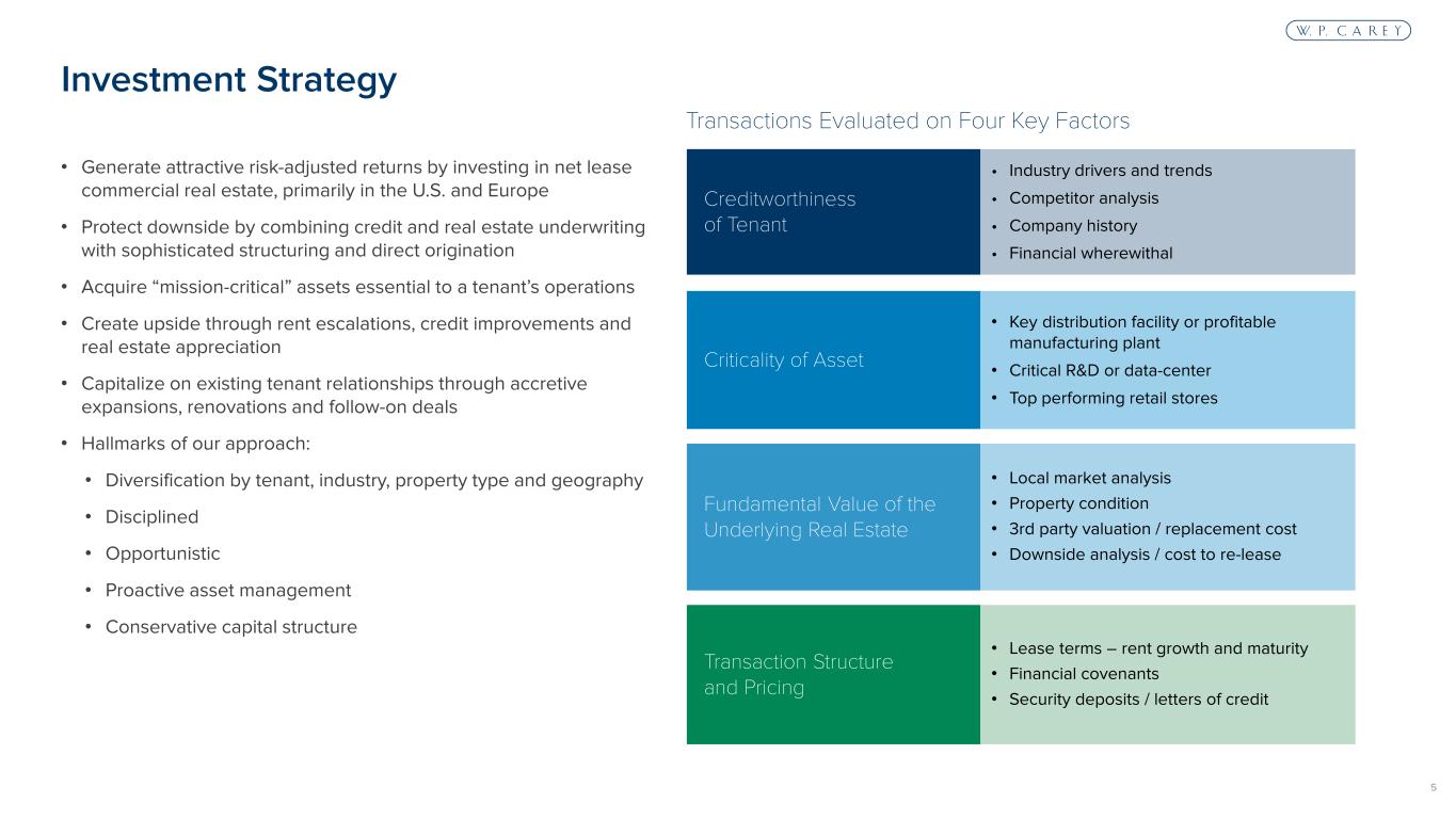4 Size One of the largest owners of net lease real estate and among the top 20 REITs in the MSCI US REIT Index Diversification Highly diversified portfolio by tenant, industry, property type and geography Track Record Successful track record of investing and operating through multiple economic cycles since 1973 led by an experienced management team Proactive Asset Management U.S. and Europe-based asset management teams Balance Sheet Investment grade balance sheet with access to multiple forms of capital Real Estate Earnings Stable cash flows derived from long-term leases that contain strong contractual rent bumps W. P. Carey (NYSE: WPC) is a REIT that specializes in investing in single-tenant net lease commercial real estate, primarily in the U.S. and Europe Company Highlights Orgill | Warehouse | Inwood, WV Apotex | Industrial | Ontario, Canada