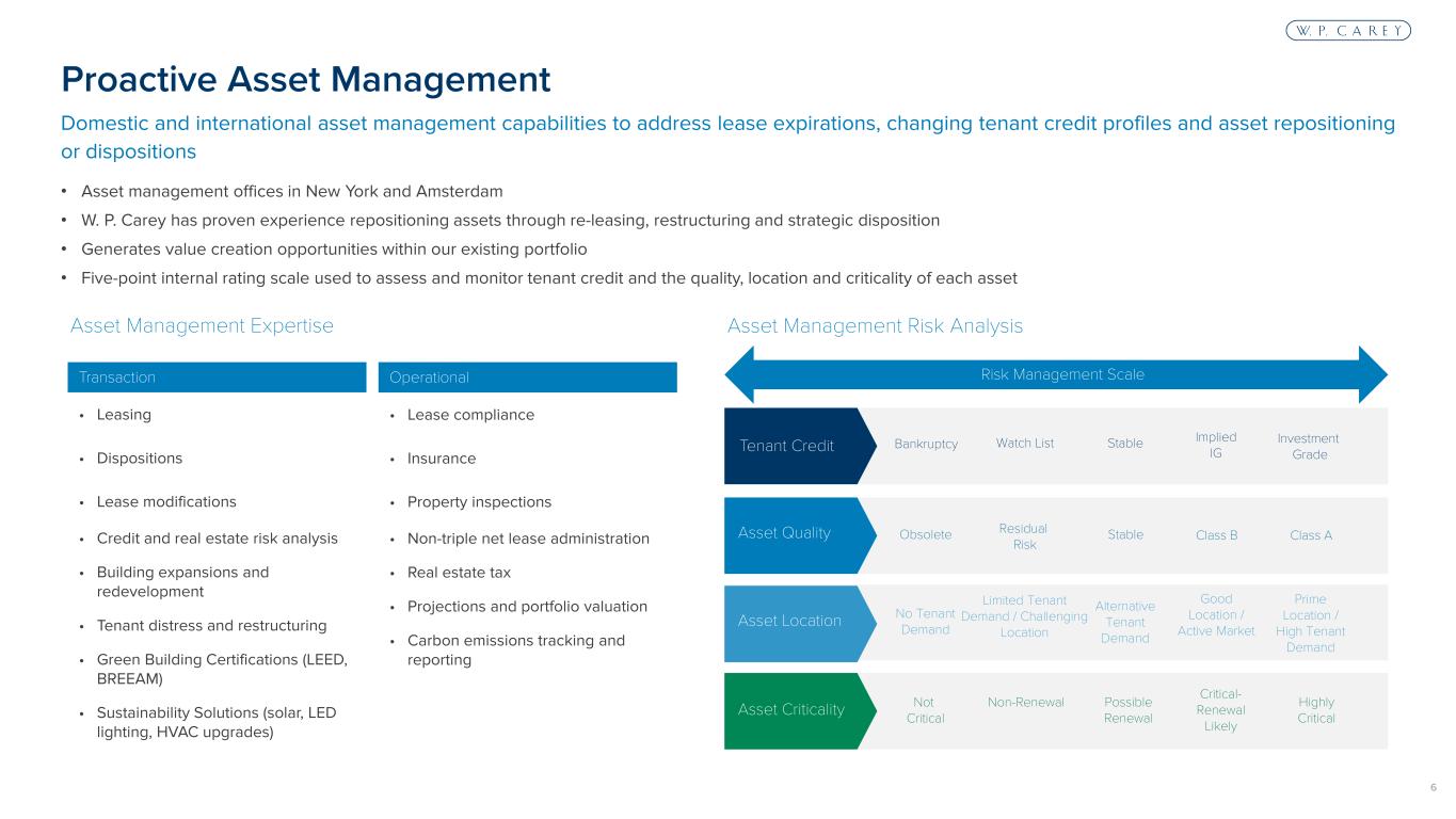 5 • Generate attractive risk-adjusted returns by investing in net lease commercial real estate, primarily in the U.S. and Europe • Protect downside by combining credit and real estate underwriting with sophisticated structuring and direct origination • Acquire “mission-critical” assets essential to a tenant’s operations • Create upside through rent escalations, credit improvements and real estate appreciation • Capitalize on existing tenant relationships through accretive expansions, renovations and follow-on deals • Hallmarks of our approach: • Diversification by tenant, industry, property type and geography • Disciplined • Opportunistic • Proactive asset management • Conservative capital structure Investment Strategy Transactions Evaluated on Four Key Factors Creditworthiness of Tenant • Industry drivers and trends • Competitor analysis • Company history • Financial wherewithal Criticality of Asset • Key distribution facility or profitable manufacturing plant • Critical R&D or data-center • Top performing retail stores Fundamental Value of the Underlying Real Estate • Local market analysis • Property condition • 3rd party valuation / replacement cost • Downside analysis / cost to re-lease Transaction Structure and Pricing • Lease terms – rent growth and maturity • Financial covenants • Security deposits / letters of credit