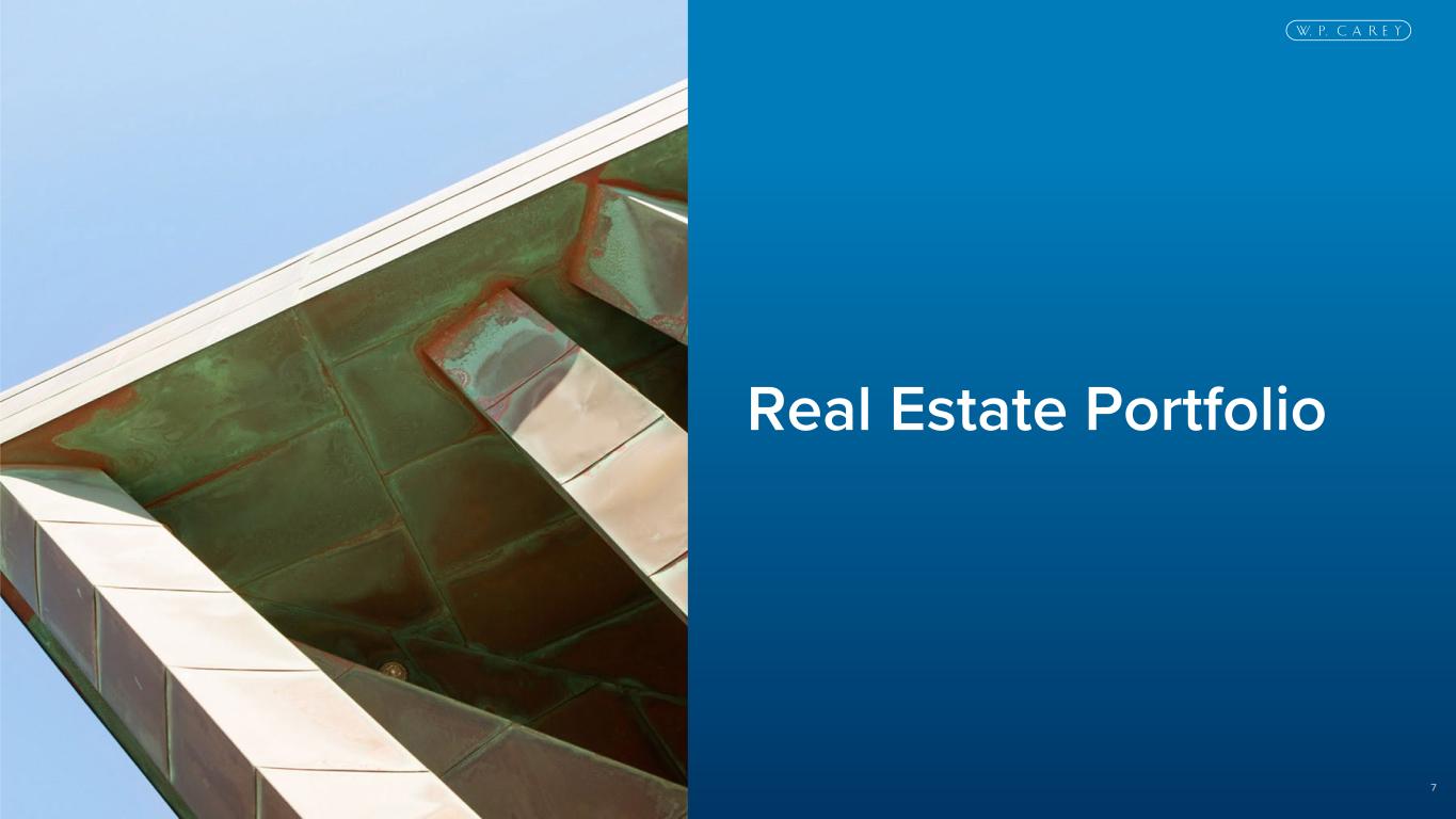6 • Asset management offices in New York and Amsterdam • W. P. Carey has proven experience repositioning assets through re-leasing, restructuring and strategic disposition • Generates value creation opportunities within our existing portfolio • Five-point internal rating scale used to assess and monitor tenant credit and the quality, location and criticality of each asset Domestic and international asset management capabilities to address lease expirations, changing tenant credit profiles and asset repositioning or dispositions Proactive Asset Management Asset Management Risk AnalysisAsset Management Expertise Bankruptcy Watch List Implied IG Investment Grade StableTenant Credit Obsolete Residual Risk Stable Class B Class AAsset Quality Not Critical Non-Renewal Possible Renewal Critical- Renewal Likely Highly CriticalAsset Criticality Asset Location No Tenant Demand Limited Tenant Demand / Challenging Location Alternative Tenant Demand Good Location / Active Market Prime Location / High Tenant Demand Operational • Lease compliance • Insurance • Property inspections • Non-triple net lease administration • Real estate tax • Projections and portfolio valuation • Carbon emissions tracking and reporting Transaction • Leasing • Dispositions • Lease modifications • Credit and real estate risk analysis • Building expansions and redevelopment • Tenant distress and restructuring • Green Building Certifications (LEED, BREEAM) • Sustainability Solutions (solar, LED lighting, HVAC upgrades) Risk Management Scale
