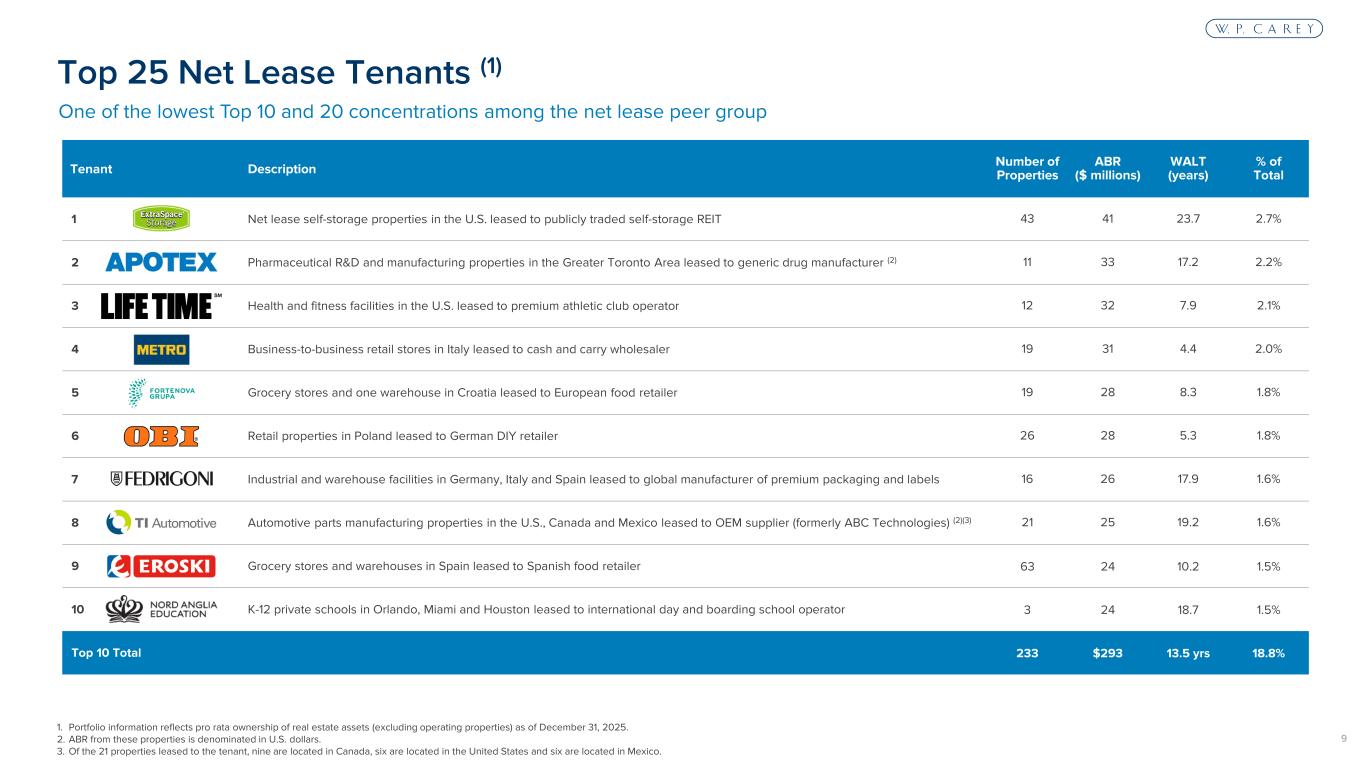 8 1. Portfolio information reflects pro rata ownership of real estate assets (excluding operating properties) as of December 31, 2025. 2. Other includes leases attributable to percentage rent (i.e., participation in the gross revenues of the tenant above a stated level), as well as leases with no escalations. Includes $41.3 million (2.7%) of ABR from a tenant (Extra Space Storage), which has both a percentage rent component and annual fixed rent increases in its lease. 3. Metrics shown for operating self-storage portfolio only; excludes net-lease self-storage assets which are captured in net-lease portfolio metrics. Large Diversified Portfolio (1) N et -L ea se P or tfo lio Number of Properties 1,682 Number of Tenants 371 Square Footage 183.5 million ABR $1.55 billion North America / Europe / Other (% of ABR) 67% / 33% / 1% Contractual Rent Escalation: CPI-linked / Fixed / Other (2) 48% / 48% / 3% WALT 12.0 years Occupancy 98.0% Investment Grade Tenants (% of ABR) 21.9% Top 10 Tenant Concentration (% of ABR) 18.8% Se lf- St or ag e (3 ) Number of Properties 11 Number of Units 5,420 Average Occupancy 87.6%