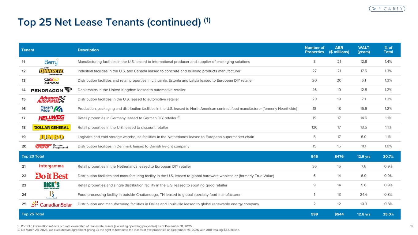 9 Tenant Description Number of Properties ABR ($ millions) WALT (years) % of Total 1 Net lease self-storage properties in the U.S. leased to publicly traded self-storage REIT 43 41 23.7 2.7% 2 Pharmaceutical R&D and manufacturing properties in the Greater Toronto Area leased to generic drug manufacturer (2) 11 33 17.2 2.2% 3 Health and fitness facilities in the U.S. leased to premium athletic club operator 12 32 7.9 2.1% 4 Business-to-business retail stores in Italy leased to cash and carry wholesaler 19 31 4.4 2.0% 5 Grocery stores and one warehouse in Croatia leased to European food retailer 19 28 8.3 1.8% 6 Retail properties in Poland leased to German DIY retailer 26 28 5.3 1.8% 7 Industrial and warehouse facilities in Germany, Italy and Spain leased to global manufacturer of premium packaging and labels 16 26 17.9 1.6% 8 Automotive parts manufacturing properties in the U.S., Canada and Mexico leased to OEM supplier (formerly ABC Technologies) (2)(3) 21 25 19.2 1.6% 9 Grocery stores and warehouses in Spain leased to Spanish food retailer 63 24 10.2 1.5% 10 K-12 private schools in Orlando, Miami and Houston leased to international day and boarding school operator 3 24 18.7 1.5% Top 10 Total 233 $293 13.5 yrs 18.8% One of the lowest Top 10 and 20 concentrations among the net lease peer group Top 25 Net Lease Tenants (1) 1. Portfolio information reflects pro rata ownership of real estate assets (excluding operating properties) as of December 31, 2025. 2. ABR from these properties is denominated in U.S. dollars. 3. Of the 21 properties leased to the tenant, nine are located in Canada, six are located in the United States and six are located in Mexico.