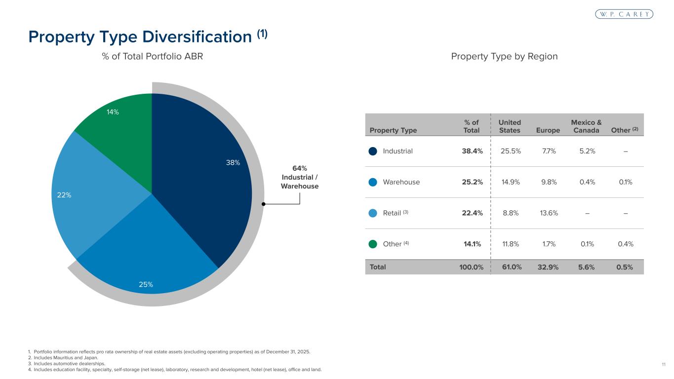10 Tenant Description Number of Properties ABR ($ millions) WALT (years) % of Total 11 Manufacturing facilities in the U.S. leased to international producer and supplier of packaging solutions 8 21 12.8 1.4% 12 Industrial facilities in the U.S. and Canada leased to concrete and building products manufacturer 27 21 17.5 1.3% 13 Distribution facilities and retail properties in Lithuania, Estonia and Latvia leased to European DIY retailer 20 20 6.1 1.3% 14 Dealerships in the United Kingdom leased to automotive retailer 46 19 12.8 1.2% 15 Distribution facilities in the U.S. leased to automotive retailer 28 19 7.1 1.2% 16 Production, packaging and distribution facilities in the U.S. leased to North American contract food manufacturer (formerly Hearthside) 18 18 16.6 1.2% 17 Retail properties in Germany leased to German DIY retailer (2) 19 17 14.6 1.1% 18 Retail properties in the U.S. leased to discount retailer 126 17 13.5 1.1% 19 Logistics and cold storage warehouse facilities in the Netherlands leased to European supermarket chain 5 17 6.0 1.1% 20 Distribution facilities in Denmark leased to Danish freight company 15 15 11.1 1.0% Top 20 Total 545 $476 12.9 yrs 30.7% 21 Retail properties in the Netherlands leased to European DIY retailer 36 15 7.6 0.9% 22 Distribution facilities and manufacturing facility in the U.S. leased to global hardware wholesaler (formerly True Value) 6 14 6.0 0.9% 23 Retail properties and single distribution facility in the U.S. leased to sporting good retailer 9 14 5.6 0.9% 24 Food processing facility in outside Chattanooga, TN leased to global specialty food manufacturer 1 13 24.6 0.8% 25 Distribution and manufacturing facilities in Dallas and Louisville leased to global renewable energy company 2 12 10.3 0.8% Top 25 Total 599 $544 12.6 yrs 35.0% Top 25 Net Lease Tenants (continued) (1) 1. Portfolio information reflects pro rata ownership of real estate assets (excluding operating properties) as of December 31, 2025. 2. On March 28, 2025, we executed an agreement giving us the right to terminate the leases at five properties on September 15, 2026 with ABR totaling $3.5 million.