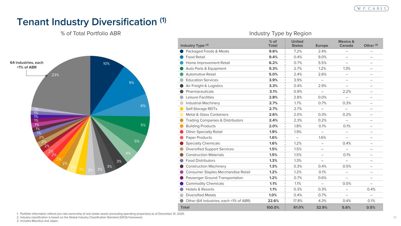 11 38% 25% 22% 14% Property Type Diversification (1) Property Type % of Total United States Europe Mexico & Canada Other (2) Industrial 38.4% 25.5% 7.7% 5.2% – Warehouse 25.2% 14.9% 9.8% 0.4% 0.1% Retail (3) 22.4% 8.8% 13.6% – – Other (4) 14.1% 11.8% 1.7% 0.1% 0.4% Total 100.0% 61.0% 32.9% 5.6% 0.5% 64% Industrial / Warehouse 1. Portfolio information reflects pro rata ownership of real estate assets (excluding operating properties) as of December 31, 2025. 2. Includes Mauritius and Japan. 3. Includes automotive dealerships. 4. Includes education facility, specialty, self-storage (net lease), laboratory, research and development, hotel (net lease), office and land. Property Type by Region% of Total Portfolio ABR
