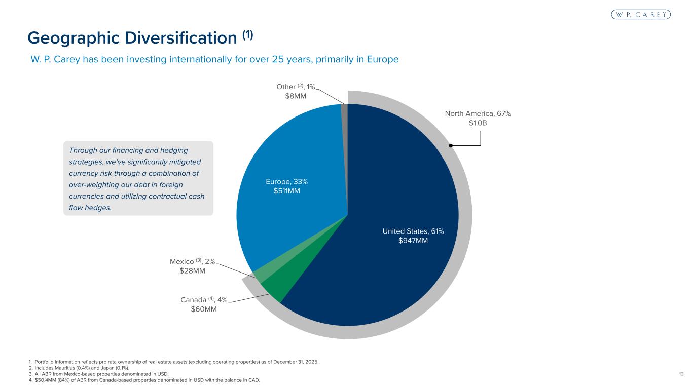 12 Industry Type (2) % of Total United States Europe Mexico & Canada Other (3) Packaged Foods & Meats 9.6% 7.2% 2.4% – – Food Retail 9.4% 0.4% 9.0% – – Home Improvement Retail 6.2% 0.7% 5.5% – – Auto Parts & Equipment 5.3% 2.7% 1.2% 1.3% – Automotive Retail 5.0% 2.4% 2.6% – – Education Services 3.9% 3.9% – – – Air Freight & Logistics 3.3% 0.4% 2.9% – – Pharmaceuticals 3.1% 0.9% – 2.2% – Leisure Facilities 2.8% 2.8% 0.0% – – Industrial Machinery 2.7% 1.7% 0.7% 0.3% – Self-Storage REITs 2.7% 2.7% – – – Metal & Glass Containers 2.6% 2.0% 0.3% 0.2% – Trading Companies & Distributors 2.4% 2.3% 0.2% – – Building Products 2.0% 1.8% 0.1% 0.1% – Other Specialty Retail 1.9% 1.9% – – – Paper Products 1.6% – 1.6% – – Specialty Chemicals 1.6% 1.2% – 0.4% – Diversified Support Services 1.5% 1.5% – – – Construction Materials 1.5% 1.5% – 0.1% – Food Distributors 1.3% 1.3% – – – Construction Machinery 1.3% 0.3% 0.4% 0.5% – Consumer Staples Merchandise Retail 1.2% 1.2% 0.1% – – Passenger Ground Transportation 1.2% 0.7% 0.6% – – Commodity Chemicals 1.1% 1.1% – 0.0% – Hotels & Resorts 1.1% 0.3% 0.3% – 0.4% Diversified Metals 1.0% 0.4% 0.7% – – Other (64 industries, each <1% of ABR) 22.6% 17.8% 4.3% 0.4% 0.1% Total 100.0% 61.0% 32.9% 5.6% 0.5% Tenant Industry Diversification (1) 1. Portfolio information reflects pro rata ownership of real estate assets (excluding operating properties) as of December 31, 2025. 2. Industry classification is based on the Global Industry Classification Standard (GICS) framework. 3. Includes Mauritius and Japan. 10% 9% 6% 5% 5% 4% 3% 3% 3%3%3% 3% 2% 2% 2% 2% 2% 2% 2% 1% 1% 1% 1% 1% 1% 1% 23% 64 industries, each <1% of ABR % of Total Portfolio ABR Industry Type by Region