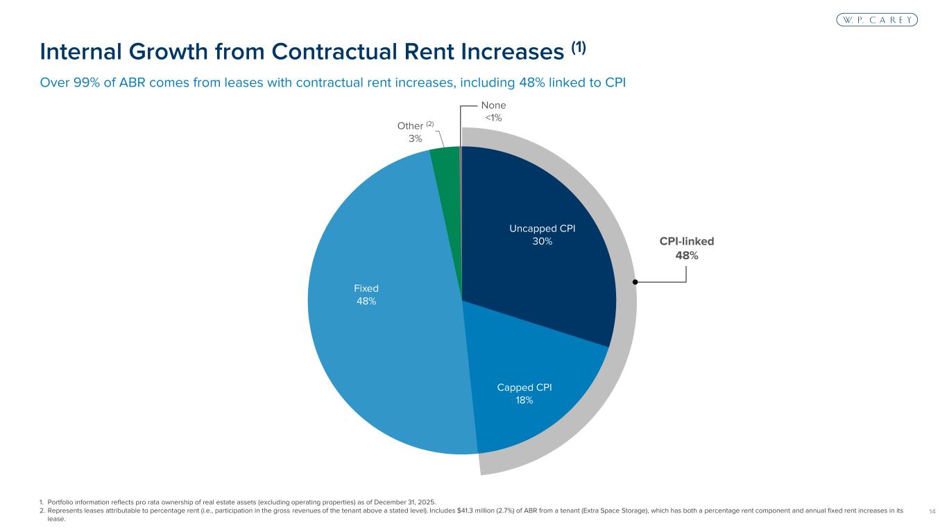 13 North America, 67% $1.0B United States, 61% $947MM Canada (4), 4% $60MM Mexico (3), 2% $28MM Europe, 33% $511MM Other (2), 1% $8MM 1. Portfolio information reflects pro rata ownership of real estate assets (excluding operating properties) as of December 31, 2025. 2. Includes Mauritius (0.4%) and Japan (0.1%). 3. All ABR from Mexico-based properties denominated in USD. 4. $50.4MM (84%) of ABR from Canada-based properties denominated in USD with the balance in CAD. W. P. Carey has been investing internationally for over 25 years, primarily in Europe Geographic Diversification (1) Through our financing and hedging strategies, we’ve significantly mitigated currency risk through a combination of over-weighting our debt in foreign currencies and utilizing contractual cash flow hedges.