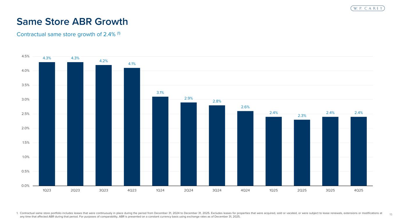 14 Uncapped CPI 30% Fixed 48% Capped CPI 18% Other (2) 3% CPI-linked 48% None <1% 1. Portfolio information reflects pro rata ownership of real estate assets (excluding operating properties) as of December 31, 2025. 2. Represents leases attributable to percentage rent (i.e., participation in the gross revenues of the tenant above a stated level). Includes $41.3 million (2.7%) of ABR from a tenant (Extra Space Storage), which has both a percentage rent component and annual fixed rent increases in its lease. Over 99% of ABR comes from leases with contractual rent increases, including 48% linked to CPI Internal Growth from Contractual Rent Increases (1)