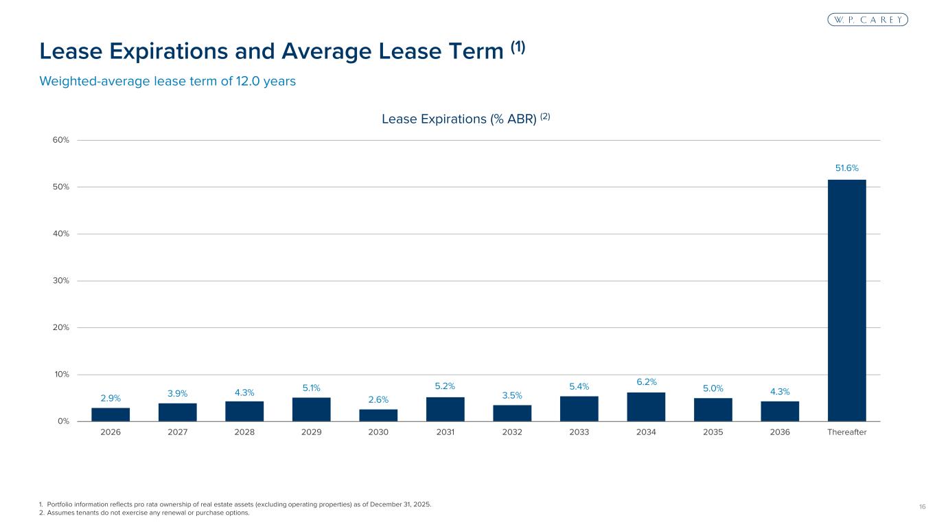 15 4.3% 4.3% 4.2% 4.1% 3.1% 2.9% 2.8% 2.6% 2.4% 2.3% 2.4% 2.4% 0.0% 0.5% 1.0% 1.5% 2.0% 2.5% 3.0% 3.5% 4.0% 4.5% 1Q23 2Q23 3Q23 4Q23 1Q24 2Q24 3Q24 4Q24 1Q25 2Q25 3Q25 4Q25 1. Contractual same store portfolio includes leases that were continuously in place during the period from December 31, 2024 to December 31, 2025. Excludes leases for properties that were acquired, sold or vacated, or were subject to lease renewals, extensions or modifications at any time that affected ABR during that period. For purposes of comparability, ABR is presented on a constant currency basis using exchange rates as of December 31, 2025. Contractual same store growth of 2.4% (1) Same Store ABR Growth
