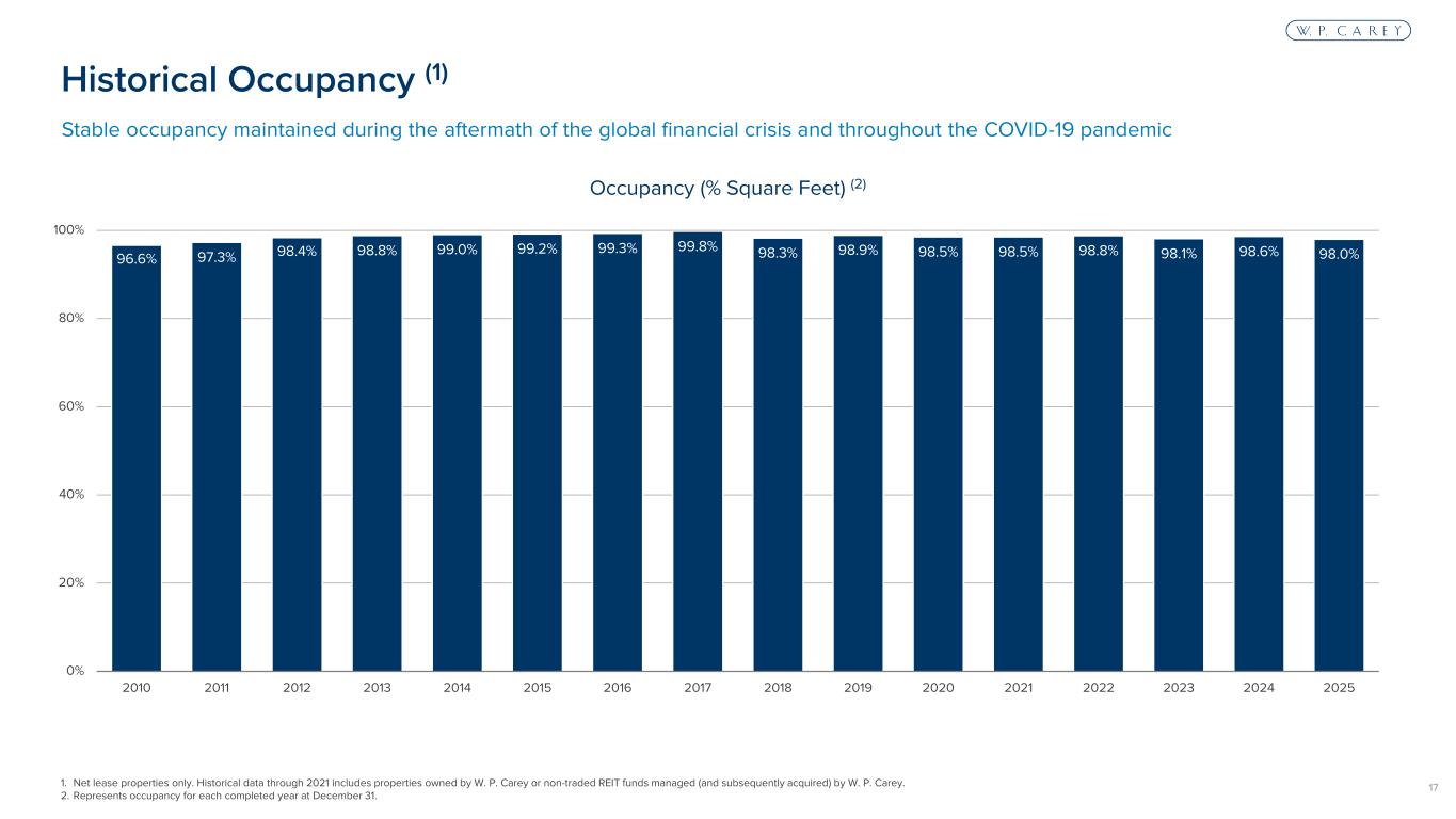 16 2.9% 3.9% 4.3% 5.1% 2.6% 5.2% 3.5% 5.4% 6.2% 5.0% 4.3% 51.6% 0% 10% 20% 30% 40% 50% 60% 2026 2027 2028 2029 2030 2031 2032 2033 2034 2035 2036 Thereafter 1. Portfolio information reflects pro rata ownership of real estate assets (excluding operating properties) as of December 31, 2025. 2. Assumes tenants do not exercise any renewal or purchase options. Weighted-average lease term of 12.0 years Lease Expirations and Average Lease Term (1) Lease Expirations (% ABR) (2)