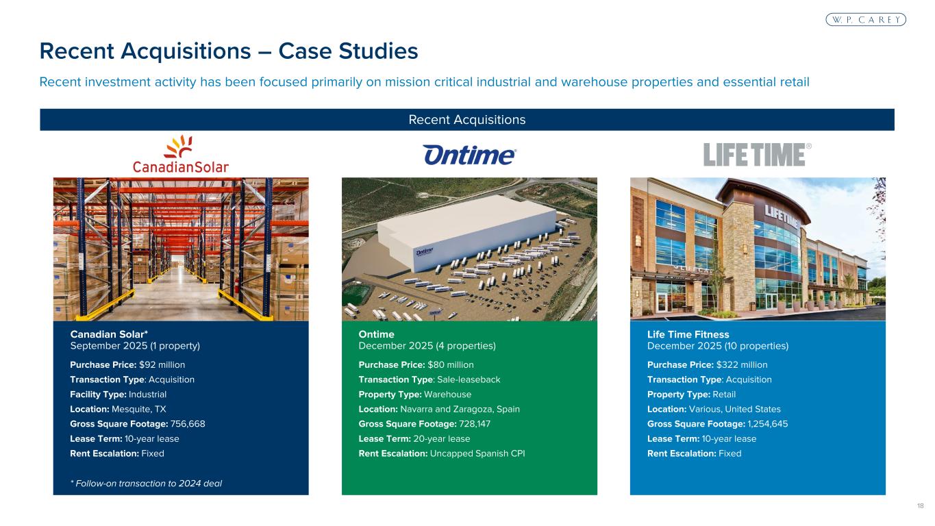 17 Historical Occupancy (1) 1. Net lease properties only. Historical data through 2021 includes properties owned by W. P. Carey or non-traded REIT funds managed (and subsequently acquired) by W. P. Carey. 2. Represents occupancy for each completed year at December 31. Stable occupancy maintained during the aftermath of the global financial crisis and throughout the COVID-19 pandemic 96.6% 97.3% 98.4% 98.8% 99.0% 99.2% 99.3% 99.8% 98.3% 98.9% 98.5% 98.5% 98.8% 98.1% 98.6% 98.0% 0% 20% 40% 60% 80% 100% 2010 2011 2012 2013 2014 2015 2016 2017 2018 2019 2020 2021 2022 2023 2024 2025 Occupancy (% Square Feet) (2)