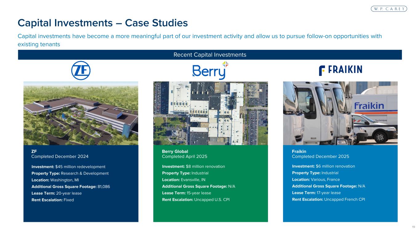 18 Recent investment activity has been focused primarily on mission critical industrial and warehouse properties and essential retail Recent Acquisitions Purchase Price: $92 million Transaction Type: Acquisition Facility Type: Industrial Location: Mesquite, TX Gross Square Footage: 756,668 Lease Term: 10-year lease Rent Escalation: Fixed * Follow-on transaction to 2024 deal Canadian Solar* September 2025 (1 property) Purchase Price: $80 million Transaction Type: Sale-leaseback Property Type: Warehouse Location: Navarra and Zaragoza, Spain Gross Square Footage: 728,147 Lease Term: 20-year lease Rent Escalation: Uncapped Spanish CPI Ontime December 2025 (4 properties) Life Time Fitness December 2025 (10 properties) Purchase Price: $322 million Transaction Type: Acquisition Property Type: Retail Location: Various, United States Gross Square Footage: 1,254,645 Lease Term: 10-year lease Rent Escalation: Fixed Recent Acquisitions – Case Studies
