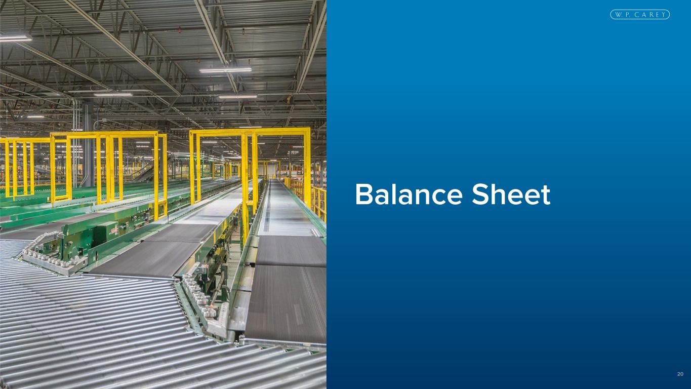 19 Capital investments have become a more meaningful part of our investment activity and allow us to pursue follow-on opportunities with existing tenants Recent Capital Investments Investment: $45 million redevelopment Property Type: Research & Development Location: Washington, MI Additional Gross Square Footage: 81,086 Lease Term: 20-year lease Rent Escalation: Fixed ZF Completed December 2024 Investment: $8 million renovation Property Type: Industrial Location: Evansville, IN Additional Gross Square Footage: N/A Lease Term: 15-year lease Rent Escalation: Uncapped U.S. CPI Berry Global Completed April 2025 Investment: $6 million renovation Property Type: Industrial Location: Various, France Additional Gross Square Footage: N/A Lease Term: 17-year lease Rent Escalation: Uncapped French CPI Fraikin Completed December 2025 Capital Investments – Case Studies
