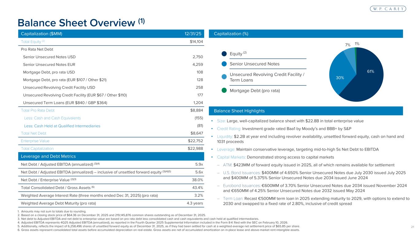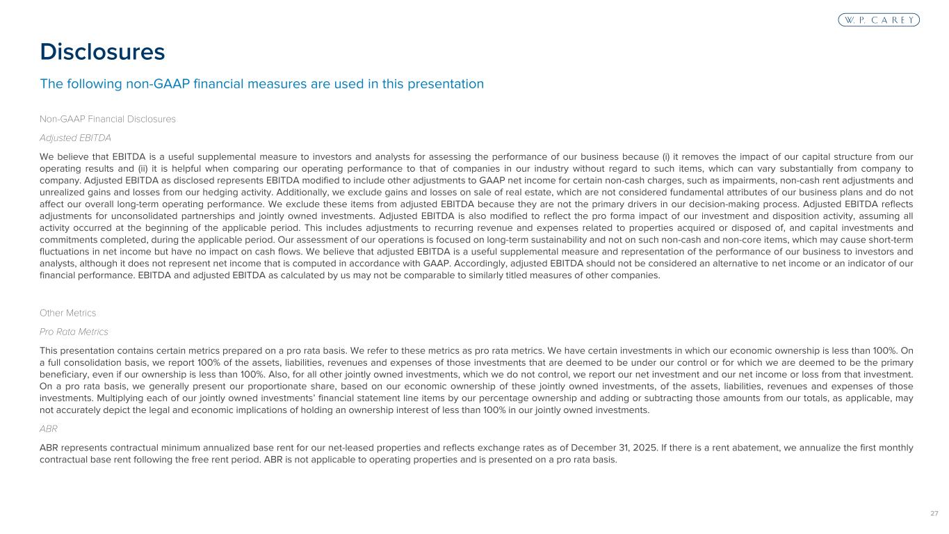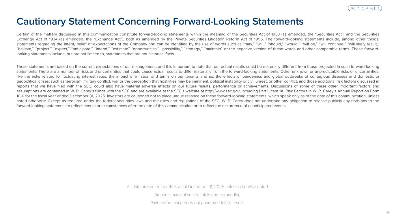 26 Certain of the matters discussed in this communication constitute forward-looking statements within the meaning of the Securities Act of 1933 (as amended, the “Securities Act”) and the Securities Exchange Act of 1934 (as amended, the “Exchange Act”), both as amended by the Private Securities Litigation Reform Act of 1995. The forward-looking statements include, among other things, statements regarding the intent, belief or expectations of the Company and can be identified by the use of words such as “may,” “will,” “should,” “would,” “will be,” “will continue,” “will likely result,” “believe,” “project,” “expect,” “anticipate,” “intend,” “estimate” “opportunities,” “possibility,” “strategy,” “maintain” or the negative version of these words and other comparable terms. These forward- looking statements include, but are not limited to, statements that are not historical facts. These statements are based on the current expectations of our management, and it is important to note that our actual results could be materially different from those projected in such forward-looking statements. There are a number of risks and uncertainties that could cause actual results to differ materially from the forward-looking statements. Other unknown or unpredictable risks or uncertainties, like the risks related to fluctuating interest rates, the impact of inflation and tariffs on our tenants and us, the effects of pandemics and global outbreaks of contagious diseases and domestic or geopolitical crises, such as terrorism, military conflict, war or the perception that hostilities may be imminent, political instability or civil unrest, or other conflict, and those additional risk factors discussed in reports that we have filed with the SEC, could also have material adverse effects on our future results, performance or achievements. Discussions of some of these other important factors and assumptions are contained in W. P. Carey’s filings with the SEC and are available at the SEC’s website at http://www.sec.gov, including Part I, Item 1A. Risk Factors in W. P. Carey’s Annual Report on Form 10-K for the fiscal year ended December 31, 2025. Investors are cautioned not to place undue reliance on these forward-looking statements, which speak only as of the date of this communication, unless noted otherwise. Except as required under the federal securities laws and the rules and regulations of the SEC, W. P. Carey does not undertake any obligation to release publicly any revisions to the forward-looking statements to reflect events or circumstances after the date of this communication or to reflect the occurrence of unanticipated events. All data presented herein is as of December 31, 2025 unless otherwise noted. Amounts may not sum to totals due to rounding. Past performance does not guarantee future results. Cautionary Statement Concerning Forward-Looking Statements