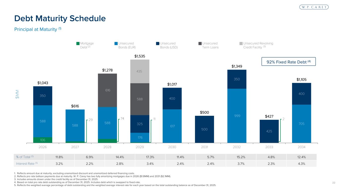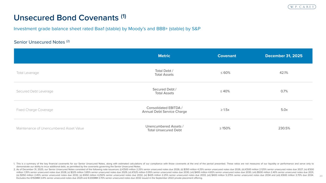 22 % of Total (5) 11.8% 6.9% 14.4% 17.3% 11.4% 5.7% 15.2% 4.8% 12.4% Interest Rate (5) 3.2% 2.2% 2.8% 3.4% 2.4% 2.4% 3.7% 2.3% 4.3% $M M 1. Reflects amount due at maturity, excluding unamortized discount and unamortized deferred financing costs. 2. Reflects pro rata balloon payments due at maturity. W. P. Carey has two fully amortizing mortgages due in 2026 ($1.8MM) and 2031 ($2.1MM). 3. Includes amounts drawn under the credit facility as of December 31, 2025. 4. Based on total pro rata debt outstanding as of December 31, 2025. Includes debt which is swapped to fixed-rate. 5. Reflects the weighted average percentage of debt outstanding and the weighted average interest rate for each year based on the total outstanding balance as of December 31, 2025. 106 29 74 11 2 588 588 588 176 617 999 705 350 325 400 500 350 425 400 616 588 435 $1,043 $616 $1,278 $1,535 $1,017 $500 $1,349 $427 $1,105 2026 2027 2028 2029 2030 2031 2032 2033 2034 Mortgage Debt Unsecured Bonds (EUR) Unsecured Bonds (USD) Unsecured Term Loans Unsecured Revolving Credit Facility(2) (3) Debt Maturity Schedule Principal at Maturity (1) 92% Fixed Rate Debt (4)