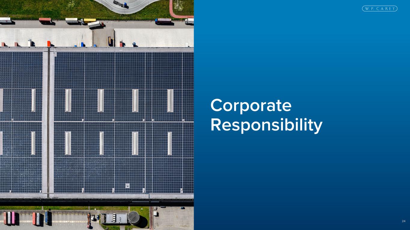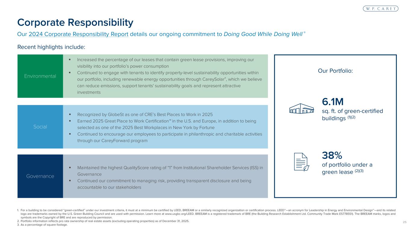 25 Our 2024 Corporate Responsibility Report details our ongoing commitment to Doing Good While Doing Well ® Corporate Responsibility Governance Social Environmental Recognized by GlobeSt as one of CRE’s Best Places to Work in 2025 Earned 2025 Great Place to Work Certification in the U.S. and Europe, in addition to being selected as one of the 2025 Best Workplaces in New York by Fortune Continued to encourage our employees to participate in philanthropic and charitable activities through our CareyForward program Maintained the highest QualityScore rating of “1” from Institutional Shareholder Services (ISS) in Governance Continued our commitment to managing risk, providing transparent disclosure and being accountable to our stakeholders Recent highlights include: Increased the percentage of our leases that contain green lease provisions, improving our visibility into our portfolio’s power consumption Continued to engage with tenants to identify property-level sustainability opportunities within our portfolio, including renewable energy opportunities through CareySolar®, which we believe can reduce emissions, support tenants' sustainability goals and represent attractive investments Our Portfolio: 1. For a building to be considered “green-certified” under our investment criteria, it must at a minimum be certified by LEED, BREEAM or a similarly recognized organization or certification process. LEED —an acronym for Leadership in Energy and Environmental Design —and its related logo are trademarks owned by the U.S. Green Building Council and are used with permission. Learn more at www.usgbc.org/LEED. BREEAM is a registered trademark of BRE (the Building Research Establishment Ltd. Community Trade Mark E5778551). The BREEAM marks, logos and symbols are the Copyright of BRE and are reproduced by permission. 2. Portfolio information reflects pro rata ownership of real estate assets (excluding operating properties) as of December 31, 2025. 3. As a percentage of square footage. 6.1M sq. ft. of green-certified buildings (1)(2) 38% of portfolio under a green lease (2)(3)
