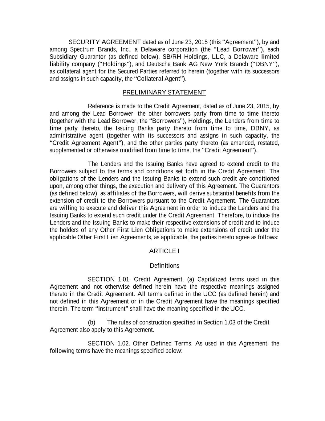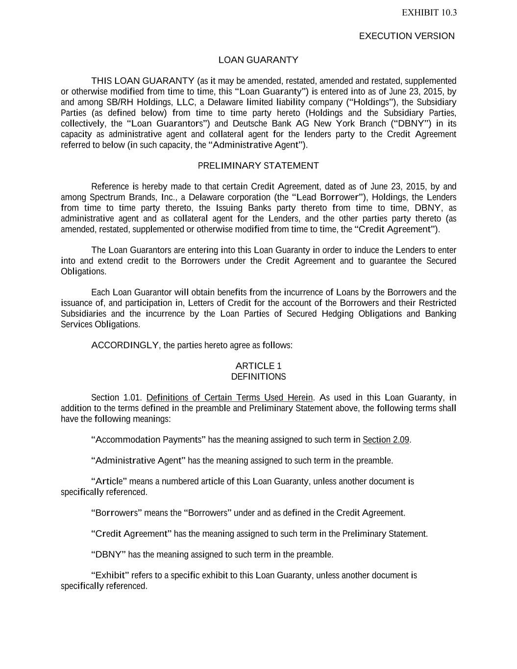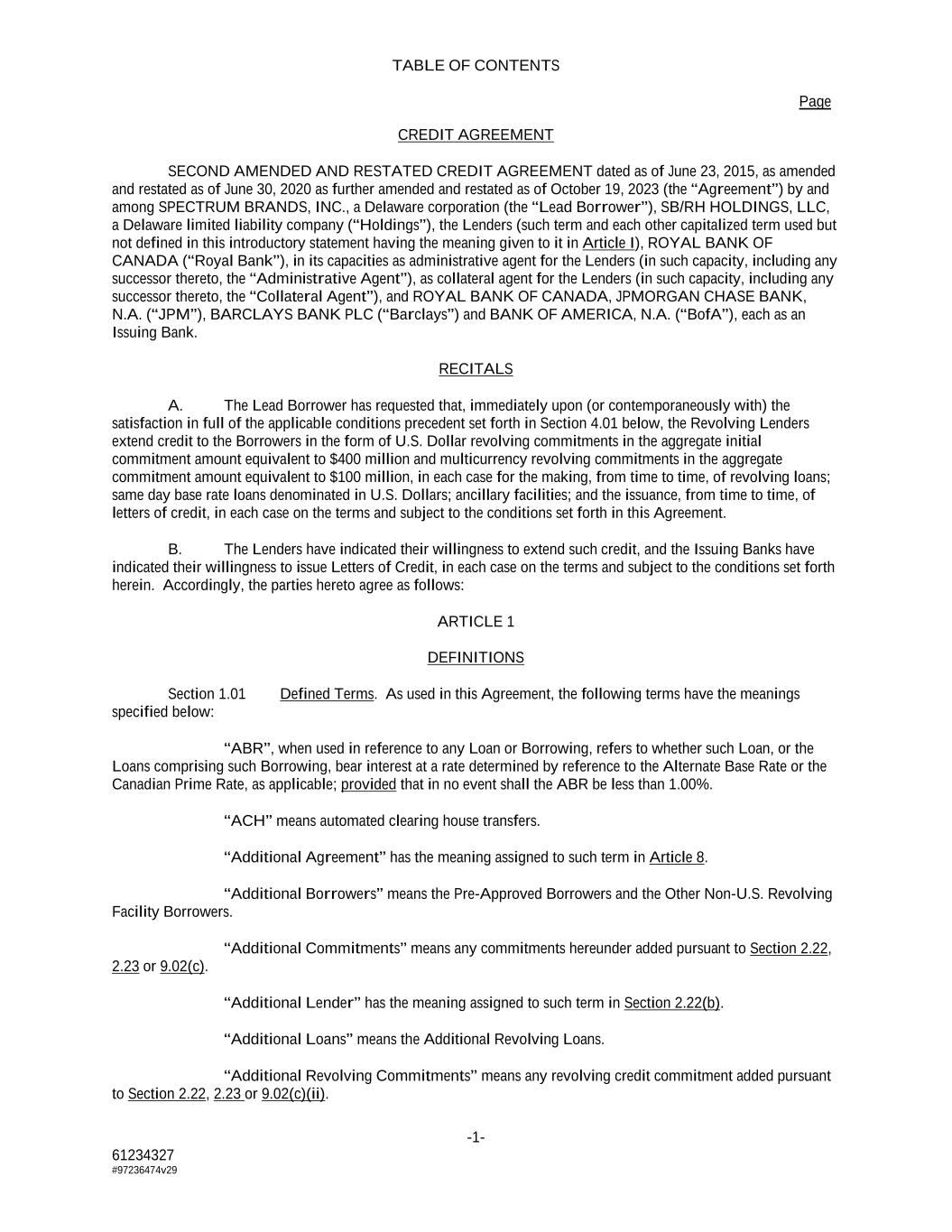 TABLE OF CONTENTS Page -1- 61234327 #97236474v29 CREDIT AGREEMENT SECOND AMENDED AND RESTATED CREDIT AGREEMENT dated as of June 23, 2015, as amended and restated as of June 30, 2020 as further amended and restated as of October 19, 2023 (the “Agreement”) by and among SPECTRUM BRANDS, INC., a Delaware corporation (the “Lead Borrower”), SB/RH HOLDINGS, LLC, a Delaware limited liability company (“Holdings”), the Lenders (such term and each other capitalized term used but not defined in this introductory statement having the meaning given to it in Article I), ROYAL BANK OF CANADA (“Royal Bank”), in its capacities as administrative agent for the Lenders (in such capacity, including any successor thereto, the “Administrative Agent”), as collateral agent for the Lenders (in such capacity, including any successor thereto, the “Collateral Agent”), and ROYAL BANK OF CANADA, JPMORGAN CHASE BANK, N.A. (“JPM”), BARCLAYS BANK PLC (“Barclays”) and BANK OF AMERICA, N.A. (“BofA”), each as an Issuing Bank. RECITALS A. The Lead Borrower has requested that, immediately upon (or contemporaneously with) the satisfaction in full of the applicable conditions precedent set forth in Section 4.01 below, the Revolving Lenders extend credit to the Borrowers in the form of U.S. Dollar revolving commitments in the aggregate initial commitment amount equivalent to $400 million and multicurrency revolving commitments in the aggregate commitment amount equivalent to $100 million, in each case for the making, from time to time, of revolving loans; same day base rate loans denominated in U.S. Dollars; ancillary facilities; and the issuance, from time to time, of letters of credit, in each case on the terms and subject to the conditions set forth in this Agreement. B. The Lenders have indicated their willingness to extend such credit, and the Issuing Banks have indicated their willingness to issue Letters of Credit, in each case on the terms and subject to the conditions set forth herein. Accordingly, the parties hereto agree as follows: ARTICLE 1 DEFINITIONS Section 1.01 Defined Terms. As used in this Agreement, the following terms have the meanings specified below: “ABR”, when used in reference to any Loan or Borrowing, refers to whether such Loan, or the Loans comprising such Borrowing, bear interest at a rate determined by reference to the Alternate Base Rate or the Canadian Prime Rate, as applicable; provided that in no event shall the ABR be less than 1.00%. “ACH” means automated clearing house transfers. “Additional Agreement” has the meaning assigned to such term in Article 8. “Additional Borrowers” means the Pre-Approved Borrowers and the Other Non-U.S. Revolving Facility Borrowers. “Additional Commitments” means any commitments hereunder added pursuant to Section 2.22, 2.23 or 9.02(c). “Additional Lender” has the meaning assigned to such term in Section 2.22(b). “Additional Loans” means the Additional Revolving Loans. “Additional Revolving Commitments” means any revolving credit commitment added pursuant to Section 2.22, 2.23 or 9.02(c)(ii).