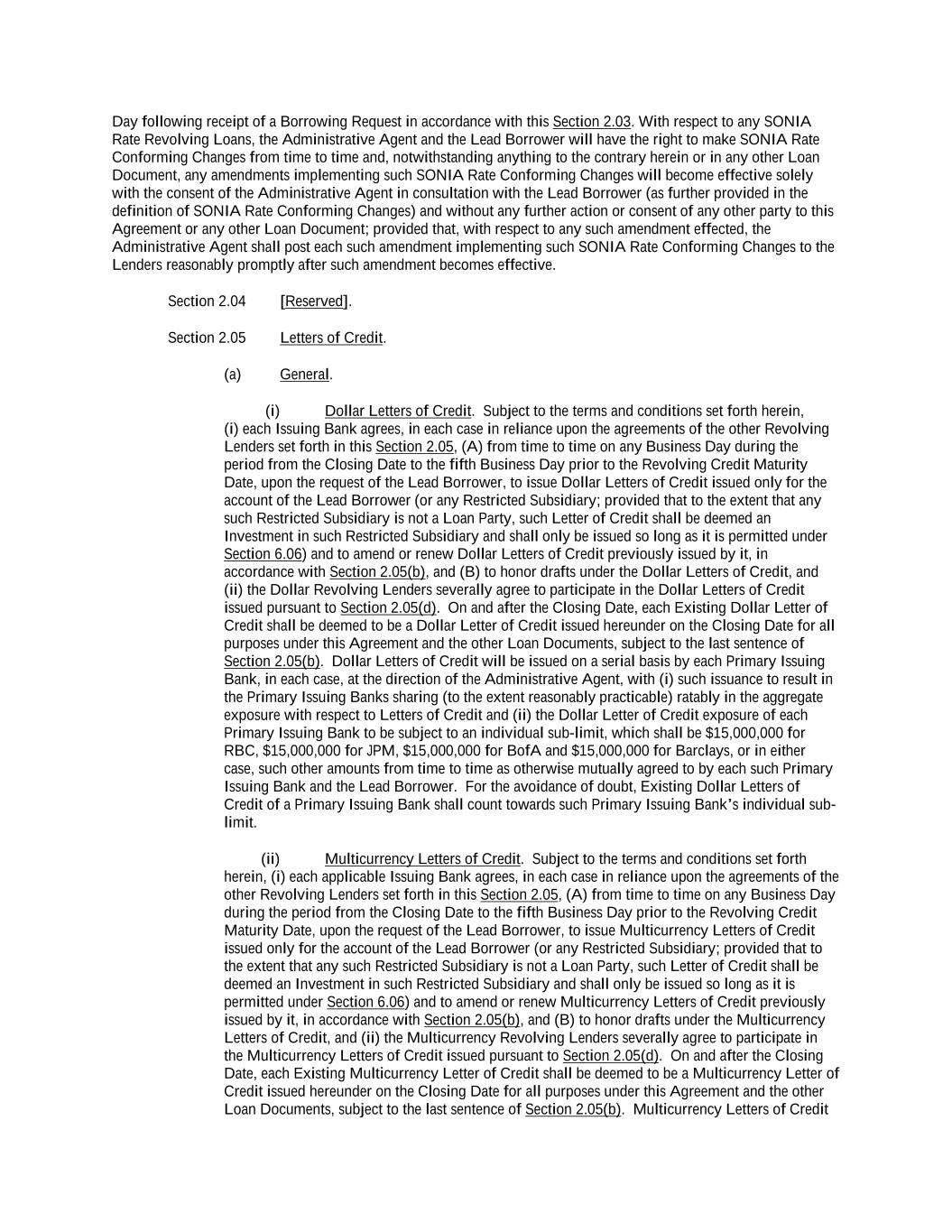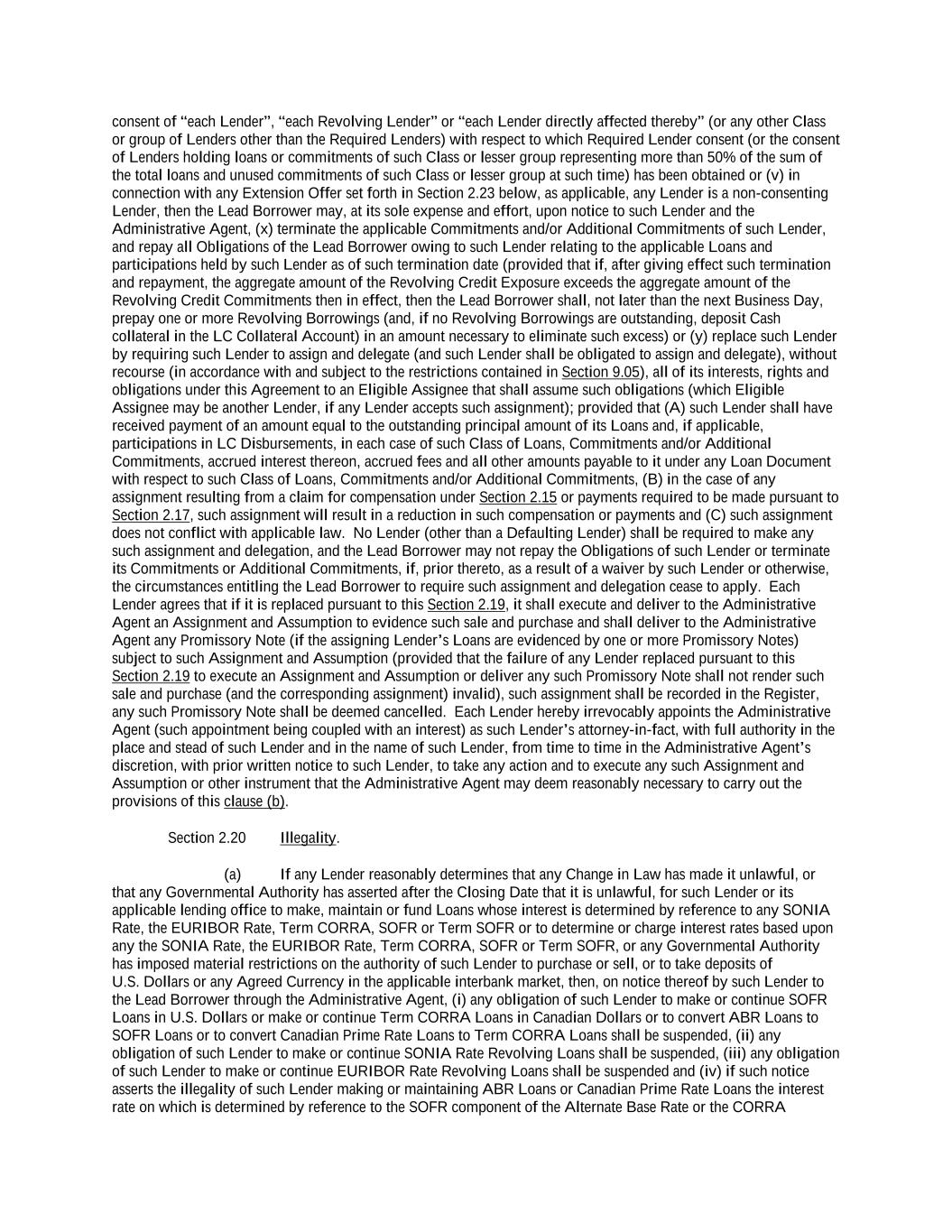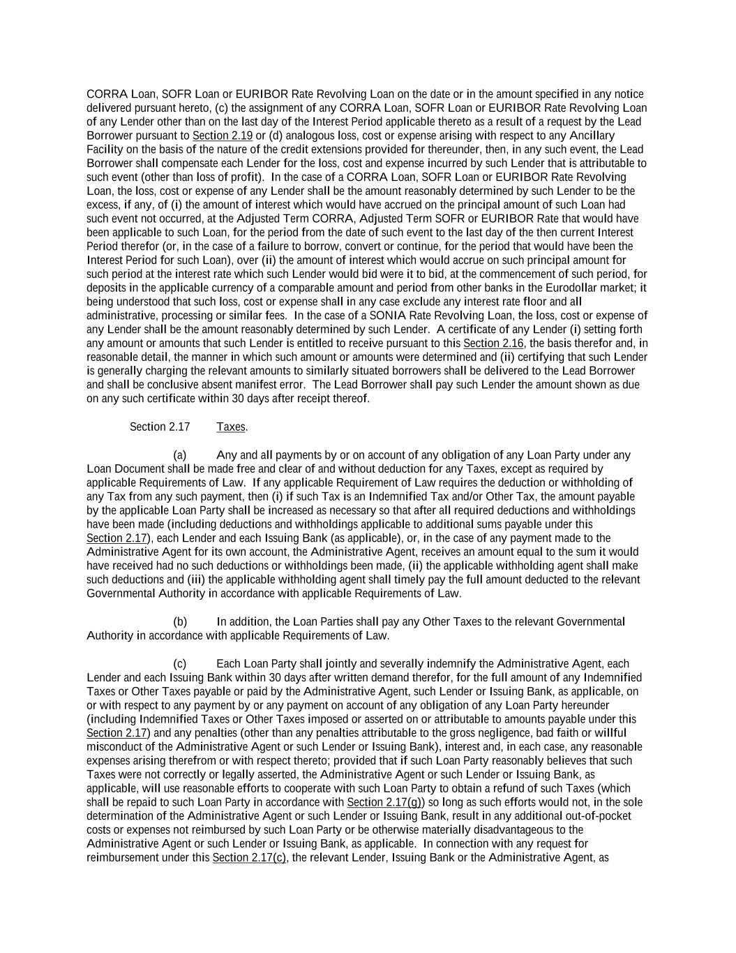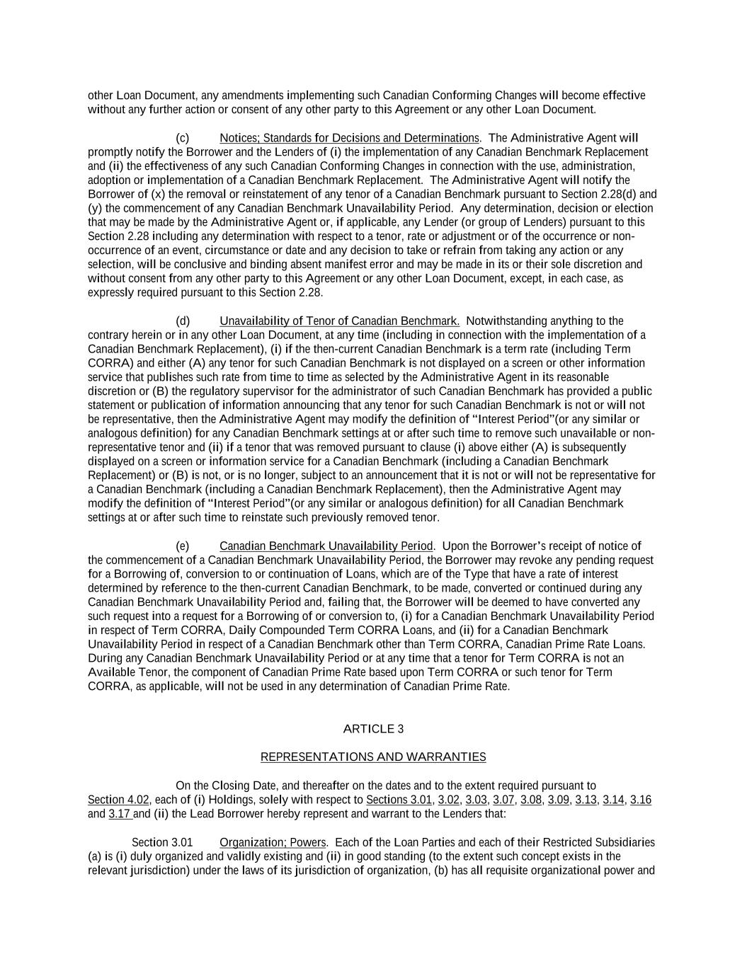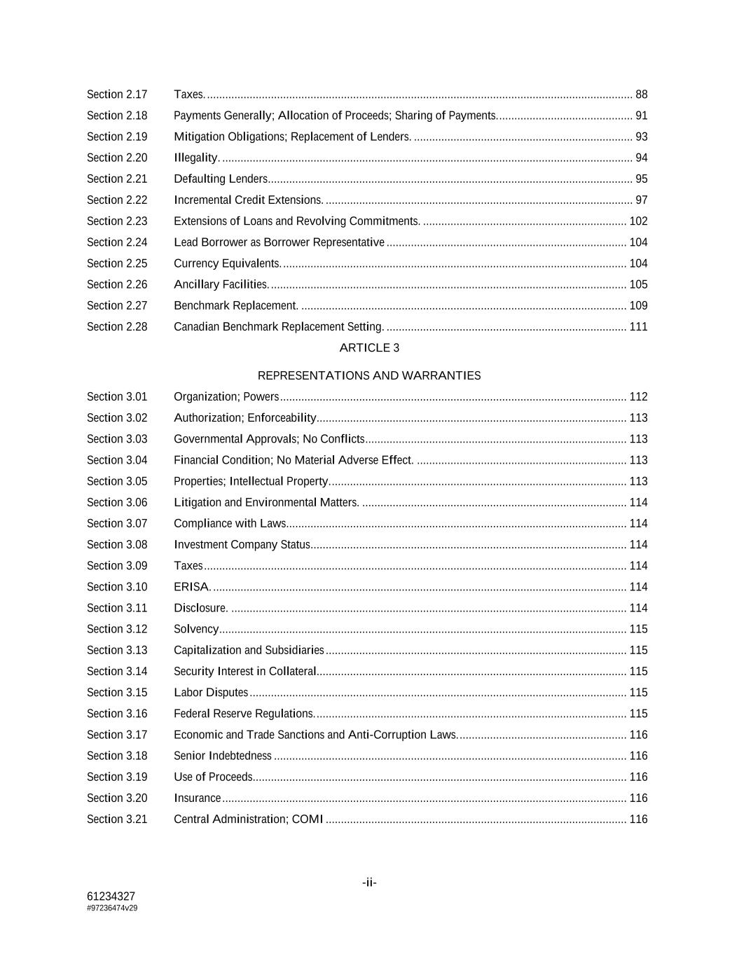 -ii- 61234327 #97236474v29 Section 2.17 Taxes. ............................................................................................................................................ 88 Section 2.18 Payments Generally; Allocation of Proceeds; Sharing of Payments. ............................................ 91 Section 2.19 Mitigation Obligations; Replacement of Lenders. ........................................................................ 93 Section 2.20 Illegality. ....................................................................................................................................... 94 Section 2.21 Defaulting Lenders ........................................................................................................................ 95 Section 2.22 Incremental Credit Extensions. ..................................................................................................... 97 Section 2.23 Extensions of Loans and Revolving Commitments. ................................................................... 102 Section 2.24 Lead Borrower as Borrower Representative ............................................................................... 104 Section 2.25 Currency Equivalents. ................................................................................................................. 104 Section 2.26 Ancillary Facilities. ..................................................................................................................... 105 Section 2.27 Benchmark Replacement. ........................................................................................................... 109 Section 2.28 Canadian Benchmark Replacement Setting. ............................................................................... 111 ARTICLE 3 REPRESENTATIONS AND WARRANTIES Section 3.01 Organization; Powers .................................................................................................................. 112 Section 3.02 Authorization; Enforceability...................................................................................................... 113 Section 3.03 Governmental Approvals; No Conflicts ...................................................................................... 113 Section 3.04 Financial Condition; No Material Adverse Effect. ..................................................................... 113 Section 3.05 Properties; Intellectual Property. ................................................................................................. 113 Section 3.06 Litigation and Environmental Matters. ....................................................................................... 114 Section 3.07 Compliance with Laws ................................................................................................................ 114 Section 3.08 Investment Company Status ........................................................................................................ 114 Section 3.09 Taxes ........................................................................................................................................... 114 Section 3.10 ERISA. ........................................................................................................................................ 114 Section 3.11 Disclosure. .................................................................................................................................. 114 Section 3.12 Solvency ...................................................................................................................................... 115 Section 3.13 Capitalization and Subsidiaries ................................................................................................... 115 Section 3.14 Security Interest in Collateral...................................................................................................... 115 Section 3.15 Labor Disputes ............................................................................................................................ 115 Section 3.16 Federal Reserve Regulations. ...................................................................................................... 115 Section 3.17 Economic and Trade Sanctions and Anti-Corruption Laws. ....................................................... 116 Section 3.18 Senior Indebtedness .................................................................................................................... 116 Section 3.19 Use of Proceeds ........................................................................................................................... 116 Section 3.20 Insurance ..................................................................................................................................... 116 Section 3.21 Central Administration; COMI ................................................................................................... 116