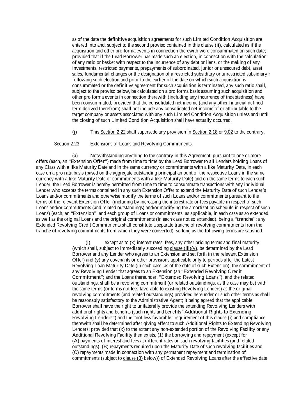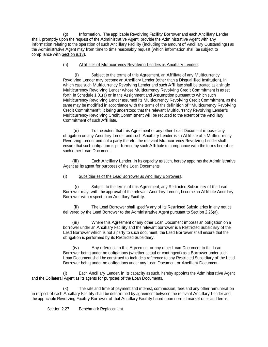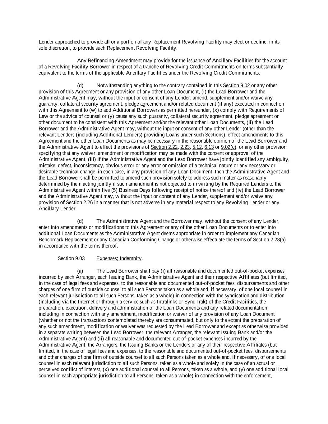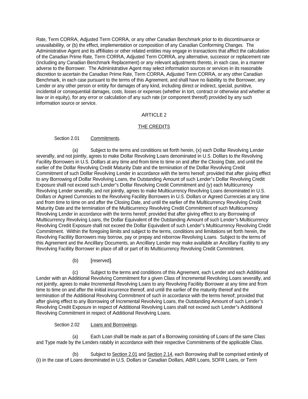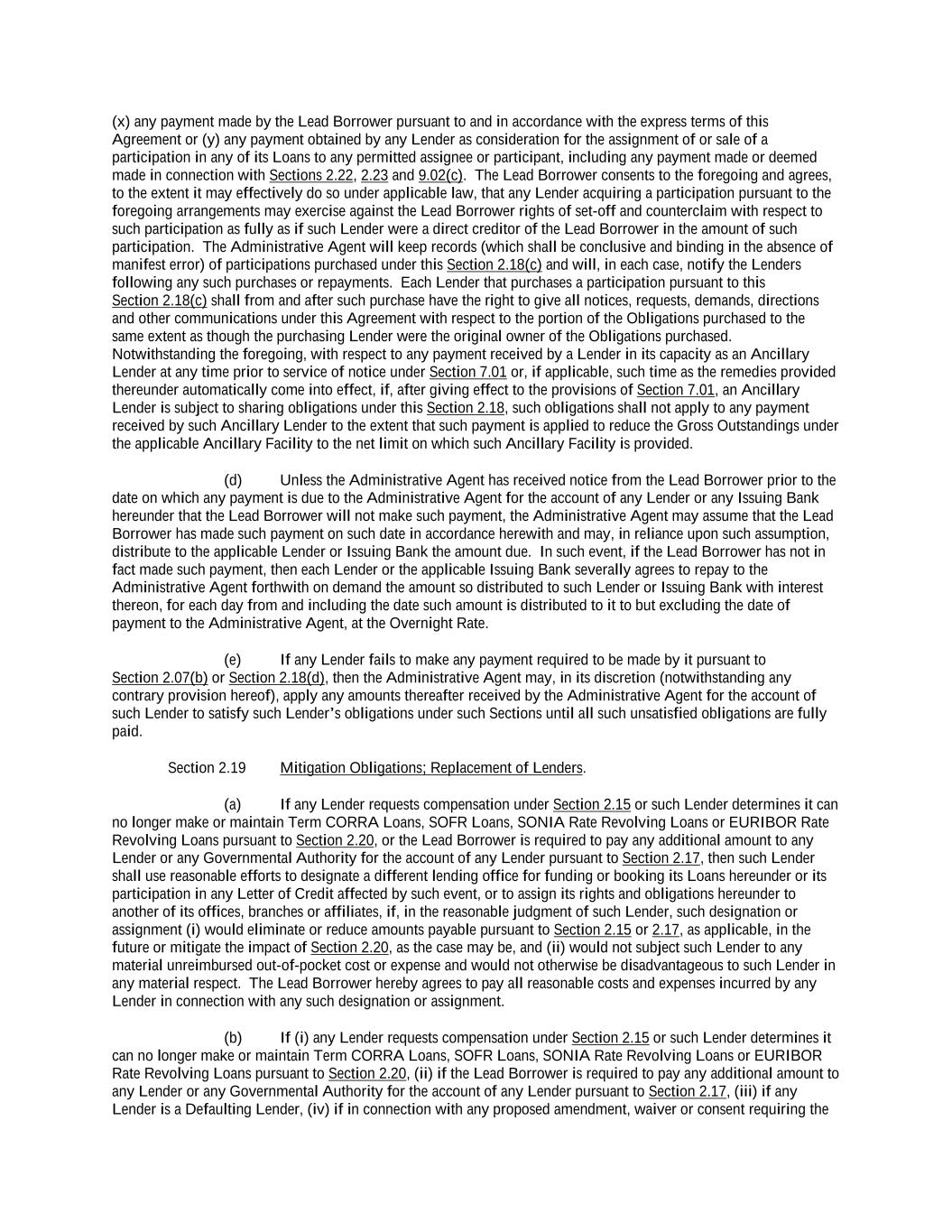 -ii- 61234327 #97236474v29 Section 2.17 Taxes. ............................................................................................................................................ 88 Section 2.18 Payments Generally; Allocation of Proceeds; Sharing of Payments. ............................................ 91 Section 2.19 Mitigation Obligations; Replacement of Lenders. ........................................................................ 93 Section 2.20 Illegality. ....................................................................................................................................... 94 Section 2.21 Defaulting Lenders ........................................................................................................................ 95 Section 2.22 Incremental Credit Extensions. ..................................................................................................... 97 Section 2.23 Extensions of Loans and Revolving Commitments. ................................................................... 102 Section 2.24 Lead Borrower as Borrower Representative ............................................................................... 104 Section 2.25 Currency Equivalents. ................................................................................................................. 104 Section 2.26 Ancillary Facilities. ..................................................................................................................... 105 Section 2.27 Benchmark Replacement. ........................................................................................................... 109 Section 2.28 Canadian Benchmark Replacement Setting. ............................................................................... 111 ARTICLE 3 REPRESENTATIONS AND WARRANTIES Section 3.01 Organization; Powers .................................................................................................................. 112 Section 3.02 Authorization; Enforceability...................................................................................................... 113 Section 3.03 Governmental Approvals; No Conflicts ...................................................................................... 113 Section 3.04 Financial Condition; No Material Adverse Effect. ..................................................................... 113 Section 3.05 Properties; Intellectual Property. ................................................................................................. 113 Section 3.06 Litigation and Environmental Matters. ....................................................................................... 114 Section 3.07 Compliance with Laws ................................................................................................................ 114 Section 3.08 Investment Company Status ........................................................................................................ 114 Section 3.09 Taxes ........................................................................................................................................... 114 Section 3.10 ERISA. ........................................................................................................................................ 114 Section 3.11 Disclosure. .................................................................................................................................. 114 Section 3.12 Solvency ...................................................................................................................................... 115 Section 3.13 Capitalization and Subsidiaries ................................................................................................... 115 Section 3.14 Security Interest in Collateral...................................................................................................... 115 Section 3.15 Labor Disputes ............................................................................................................................ 115 Section 3.16 Federal Reserve Regulations. ...................................................................................................... 115 Section 3.17 Economic and Trade Sanctions and Anti-Corruption Laws. ....................................................... 116 Section 3.18 Senior Indebtedness .................................................................................................................... 116 Section 3.19 Use of Proceeds ........................................................................................................................... 116 Section 3.20 Insurance ..................................................................................................................................... 116 Section 3.21 Central Administration; COMI ................................................................................................... 116